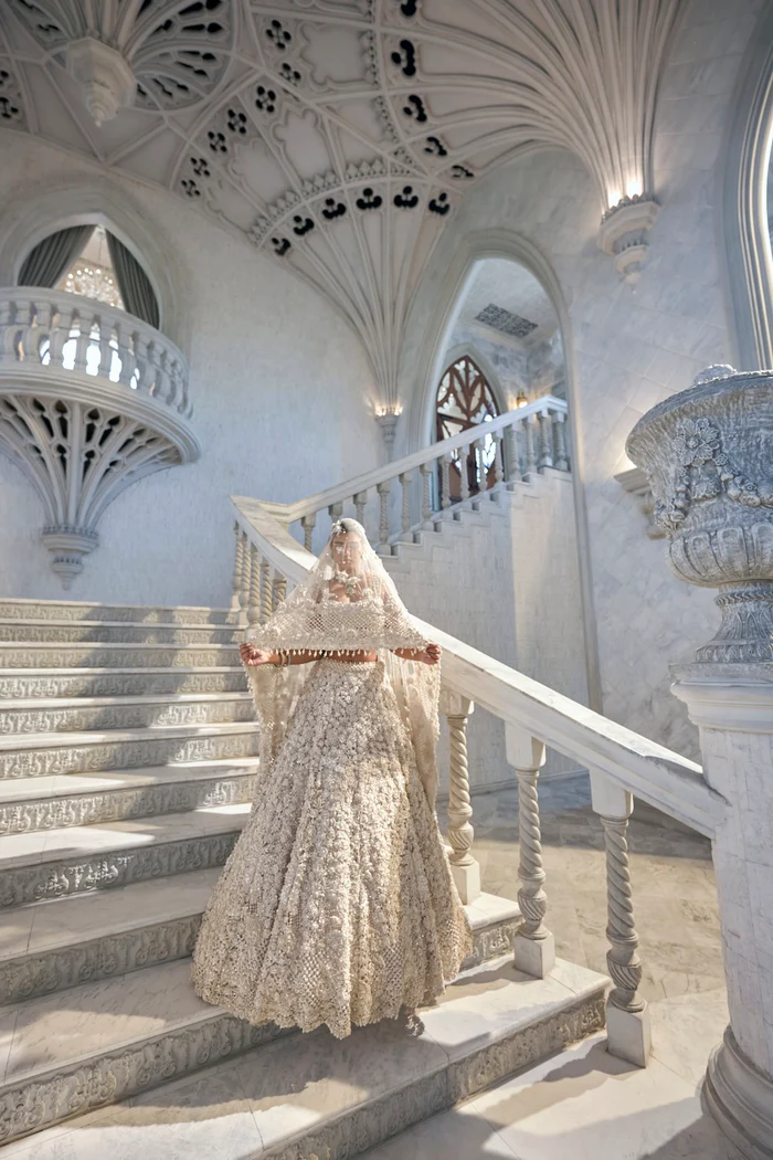 The blouse is made from pearl-encrusted silk and tulle blends, while the lehenga consists of hand-embroidered net with a premium silk lining. The dupatta is crafted from sheer net with embellished borders.