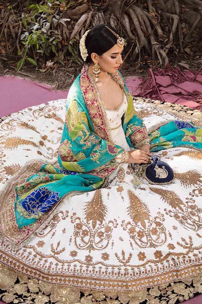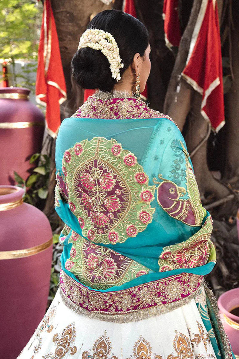 Completing the look is a sheer ferozi organza dupatta that adds a refreshing pop of color. The dupatta features a delicately tilla-embroidered base and a dramatic purple border embellished with sitara, pearls, and kiran, offering a refined contrast and a luxurious finishing touch.