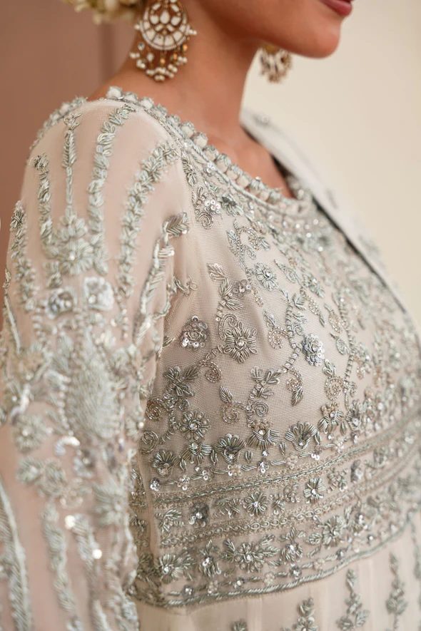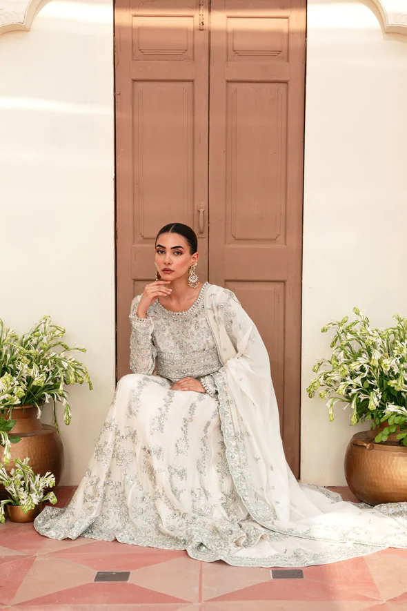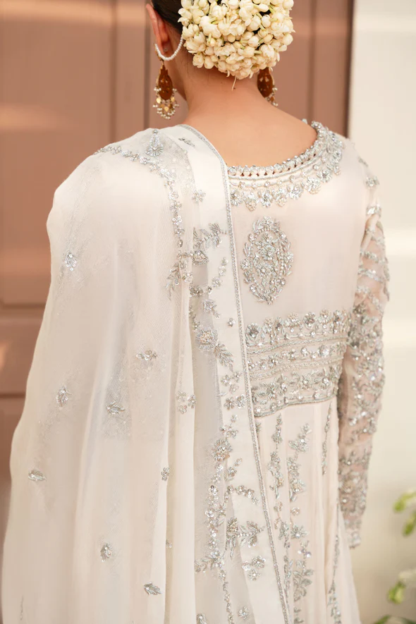 A breathtaking ivory bridal kalidaar crafted from soft tissue net, adorned with intricate silver ada work and paired with an exquisitely detailed dupatta, designed for an elegant and contemporary bridal presence.