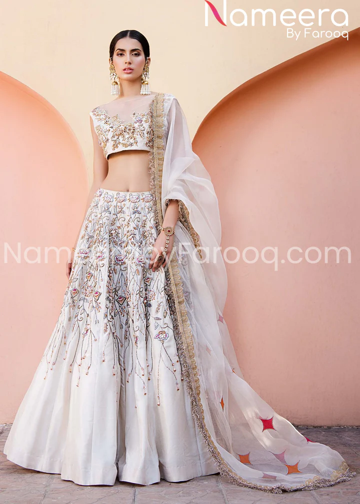 A graceful ivory white Anarkali maxi crafted from luxurious katan silk, featuring handcrafted silver and pearl embellishments, Swarovski crystals, sequins, and beadwork. Complete with a flowing chiffon dupatta, this ensemble offers timeless elegance and sophisticated bridal charm.