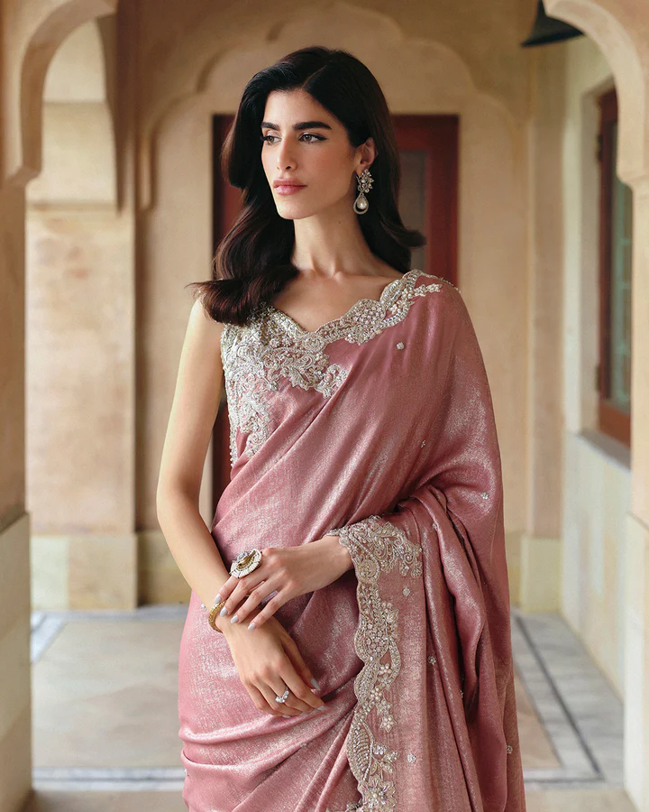 A timeless dusty pink silk saree set featuring a richly embellished blouse with pearl and dabka motifs, paired with a lavishly adorned saree and a classic silk petticoat for enduring elegance.