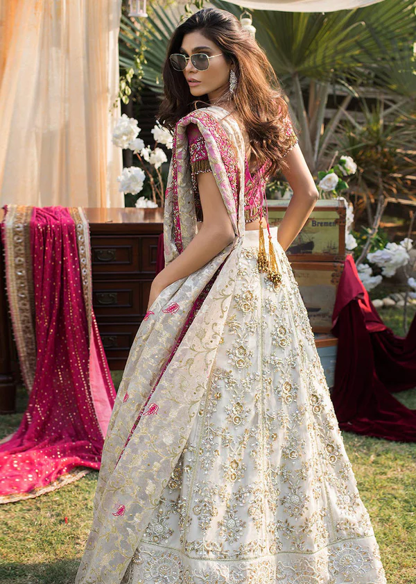 The optional second dupatta is crafted from organza and features a fully worked four-sided border. Its lightweight structure makes it perfect for bridal layering, adding versatility to the overall look.