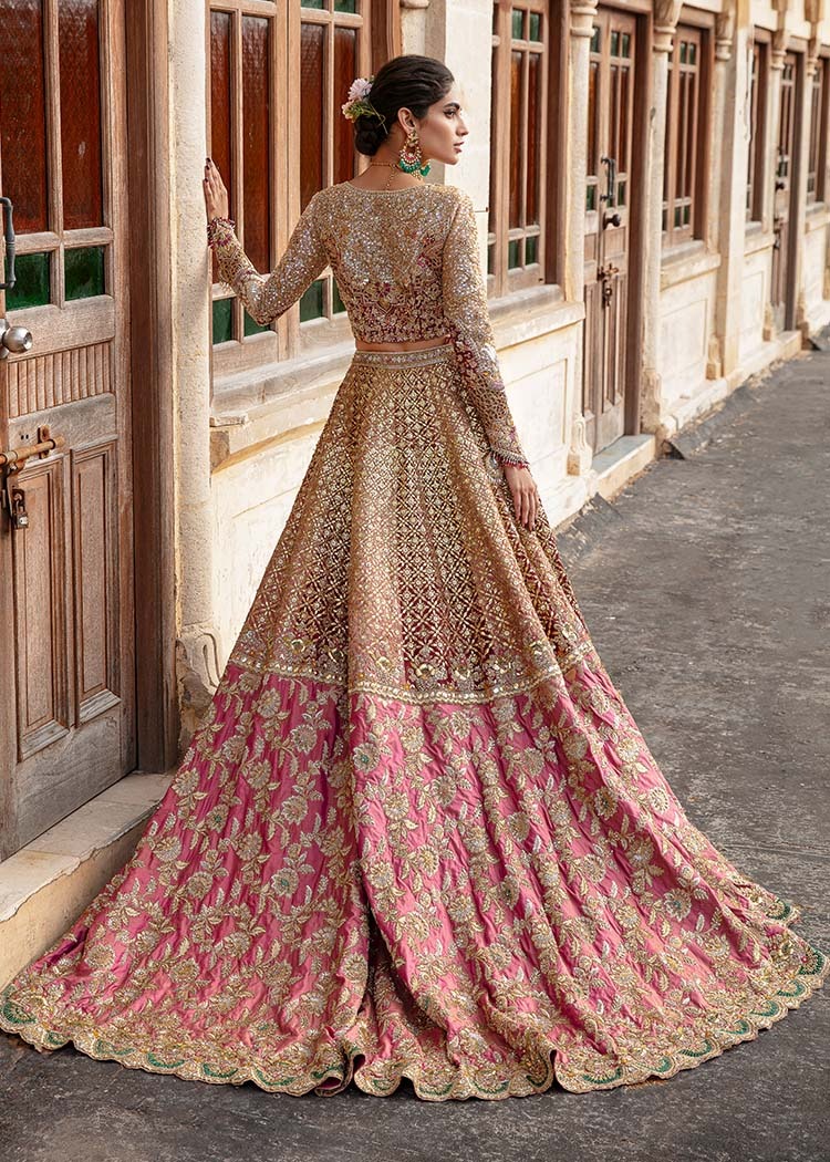A masterpiece of bridal couture featuring a richly encrusted maroon choli and a breathtaking paneled lehenga that transitions from deep gold-maroon to a vibrant blossom pink, adorned with regal hand-embroidered floral motifs.