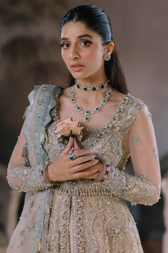 Handcrafted with sequins, beads, Swarovski crystals, cut-glass touches, kora, naqshi, tilla, and hanging motifs. Slight artisanal variations highlight its handcrafted authenticity.