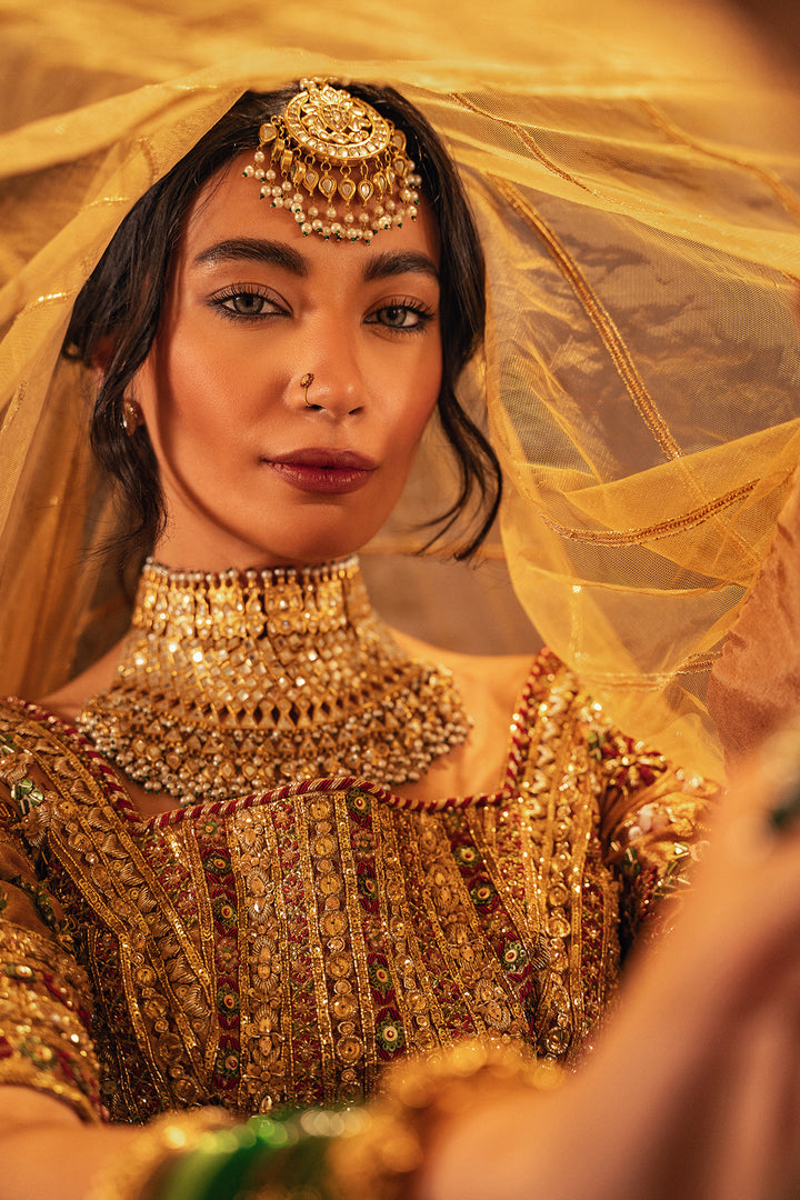 An opulent maroon and gold bridal ensemble, Mahira showcases exquisite zardozi craftsmanship, a radiant golden lehenga, and intricate hand embellishment—designed for a bride who defines elegance and grace.