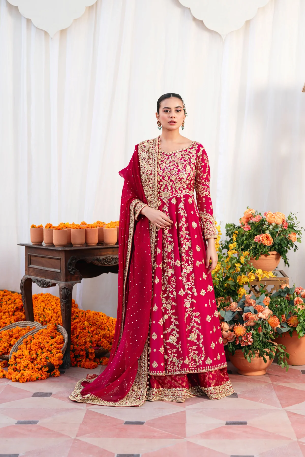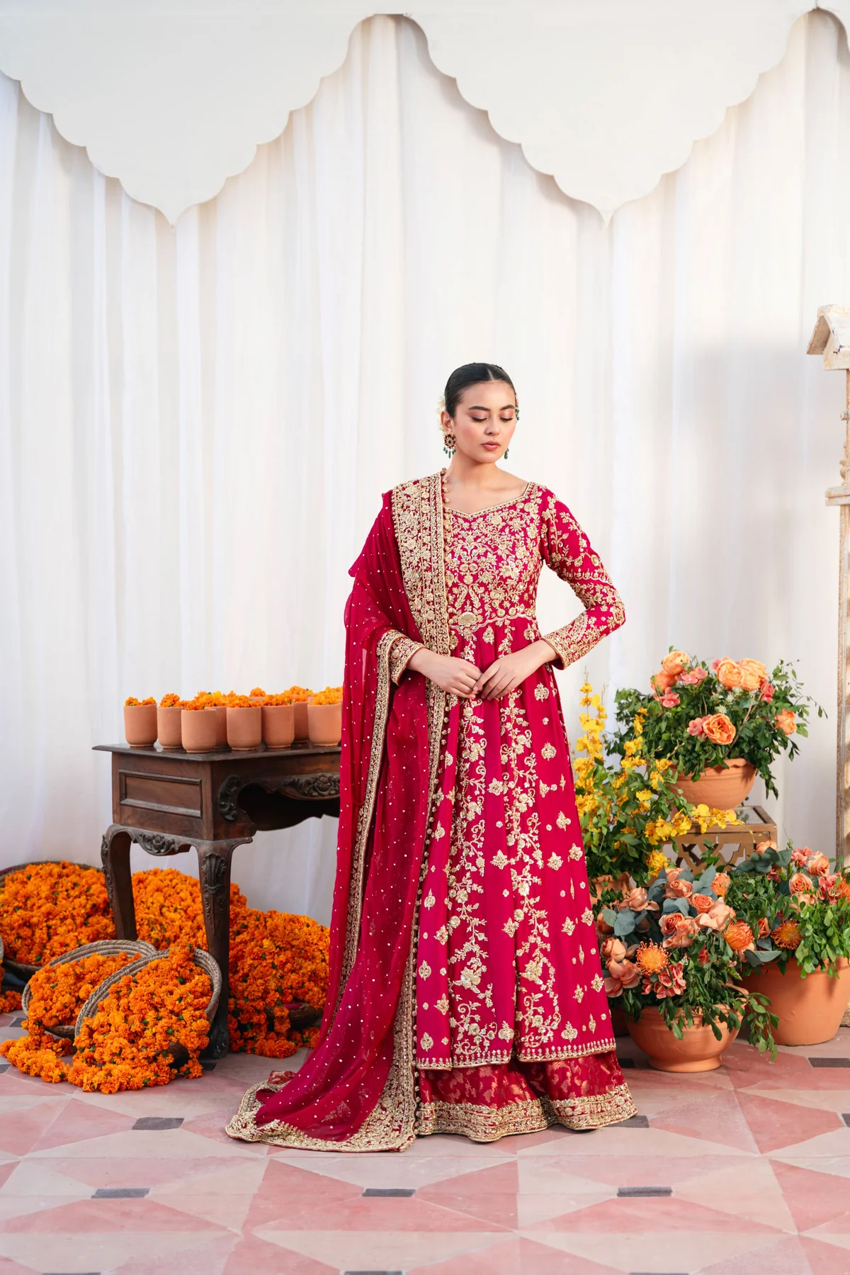 A majestic maroon bridal kalidaar crafted from pure raw silk and enriched with gold hand ada work, paired with a statement dupatta and jamawar panelled skirt for a contemporary bridal look.