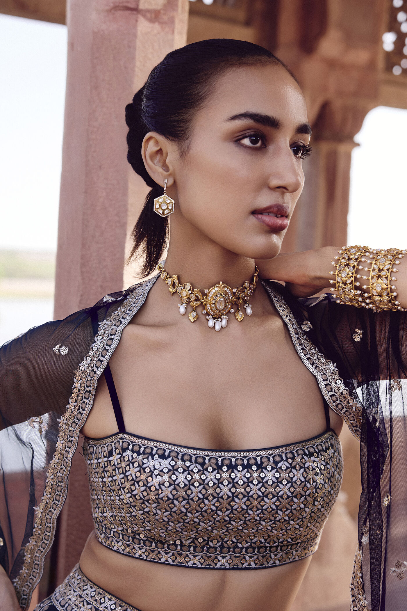 In this particular styling, the traditional dupatta has been reinterpreted as the sheer net bolero-style capelet described in the Top section. This allows for a contemporary, hands-free silhouette while maintaining the grace of a draped layer. However, if desired, a classic sheer navy net dupatta can be provided, featuring a scattered spray of sequins and a light tilla border that harmonizes with the intricate craftsmanship of the choli and lehenga.
