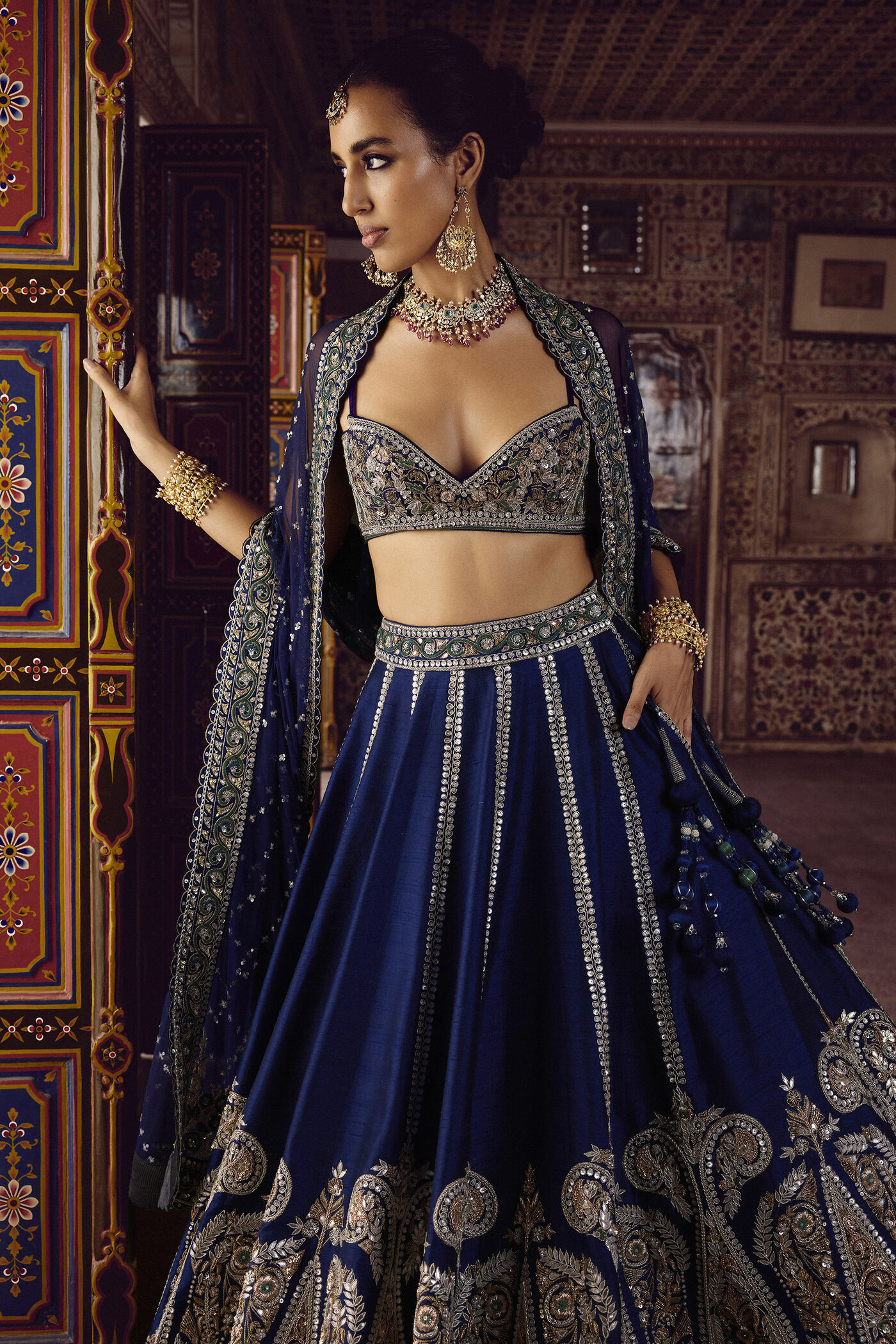 A majestic vision of contemporary heritage, this midnight cobalt ensemble features a meticulously hand-embroidered bustier and a voluminous lehenga adorned with grand, jewel-toned paisley motifs and a delicate organza cape.