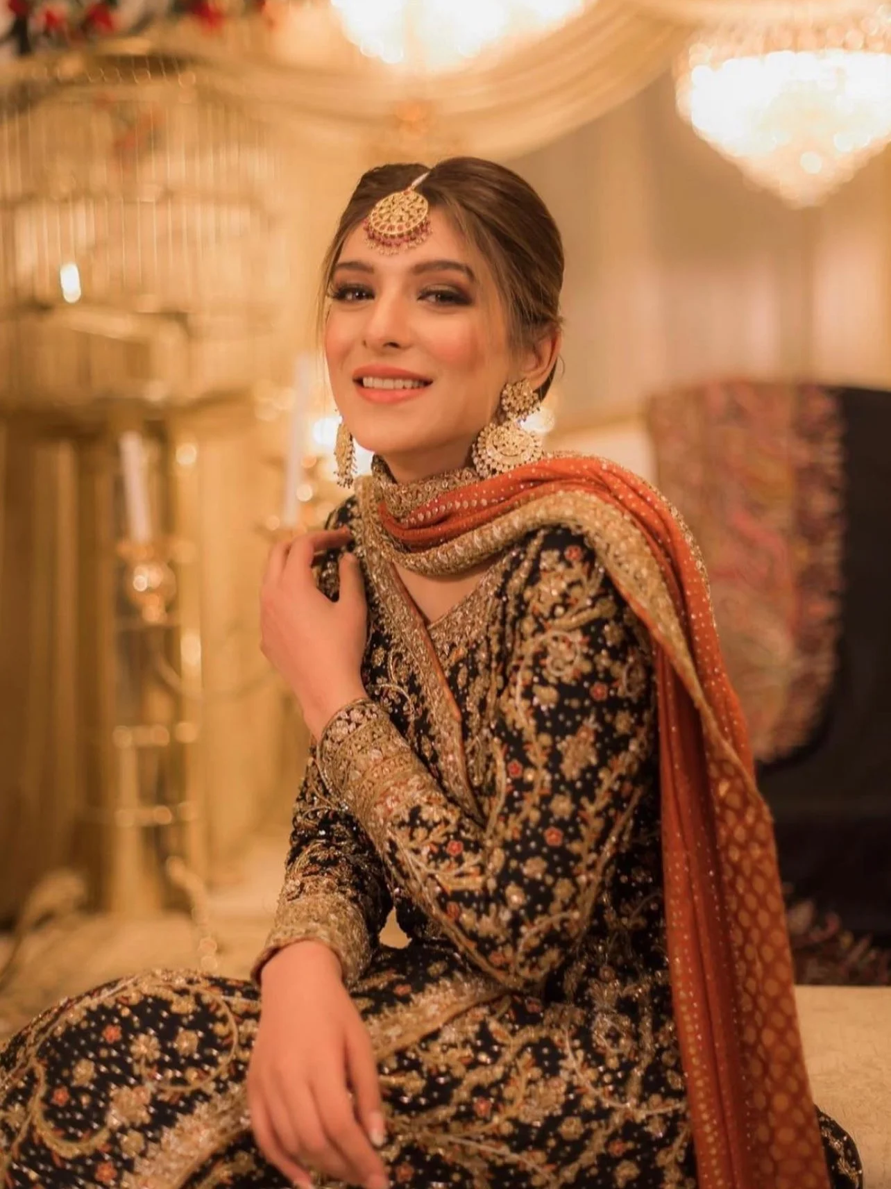 The dupatta adds a warm contrast with its rich hue, harmonizing beautifully with the gold embroidery. Light embellishment and an elegantly finished border enhance its visual appeal. Its soft drape completes the ensemble with sophistication.