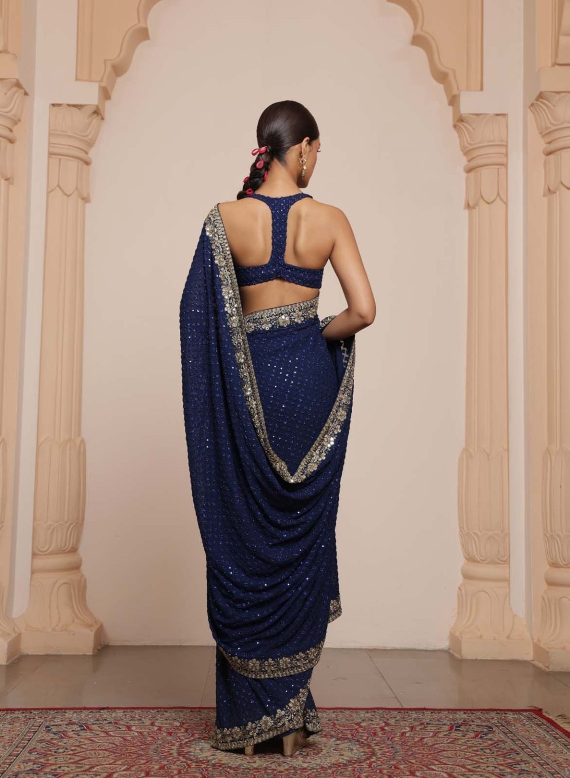 The sari is crafted in a rich midnight blue base accented with beige-gold details, creating an elegant interplay of contrast and depth. Designed for a fluid drape, it showcases hand-embroidered artistry that enhances the sophistication of the silhouette. The blend of colors and textures gives the ensemble a luxurious finish suitable for formal and festive events.