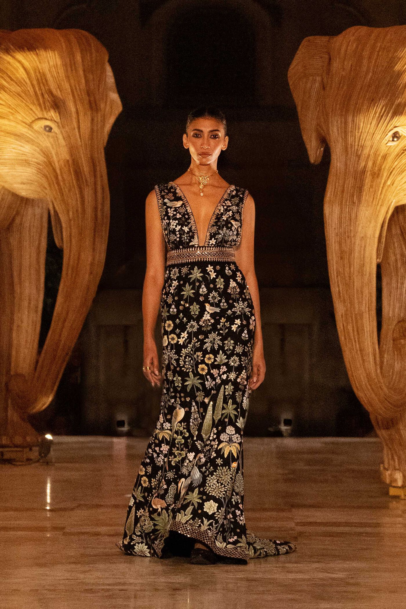 An exquisitely tailored floor-length gown in a deep noir palette, featuring a mesmerizing garden of hand-embroidered avian and botanical motifs that blend traditional craftsmanship with high-fashion elegance.