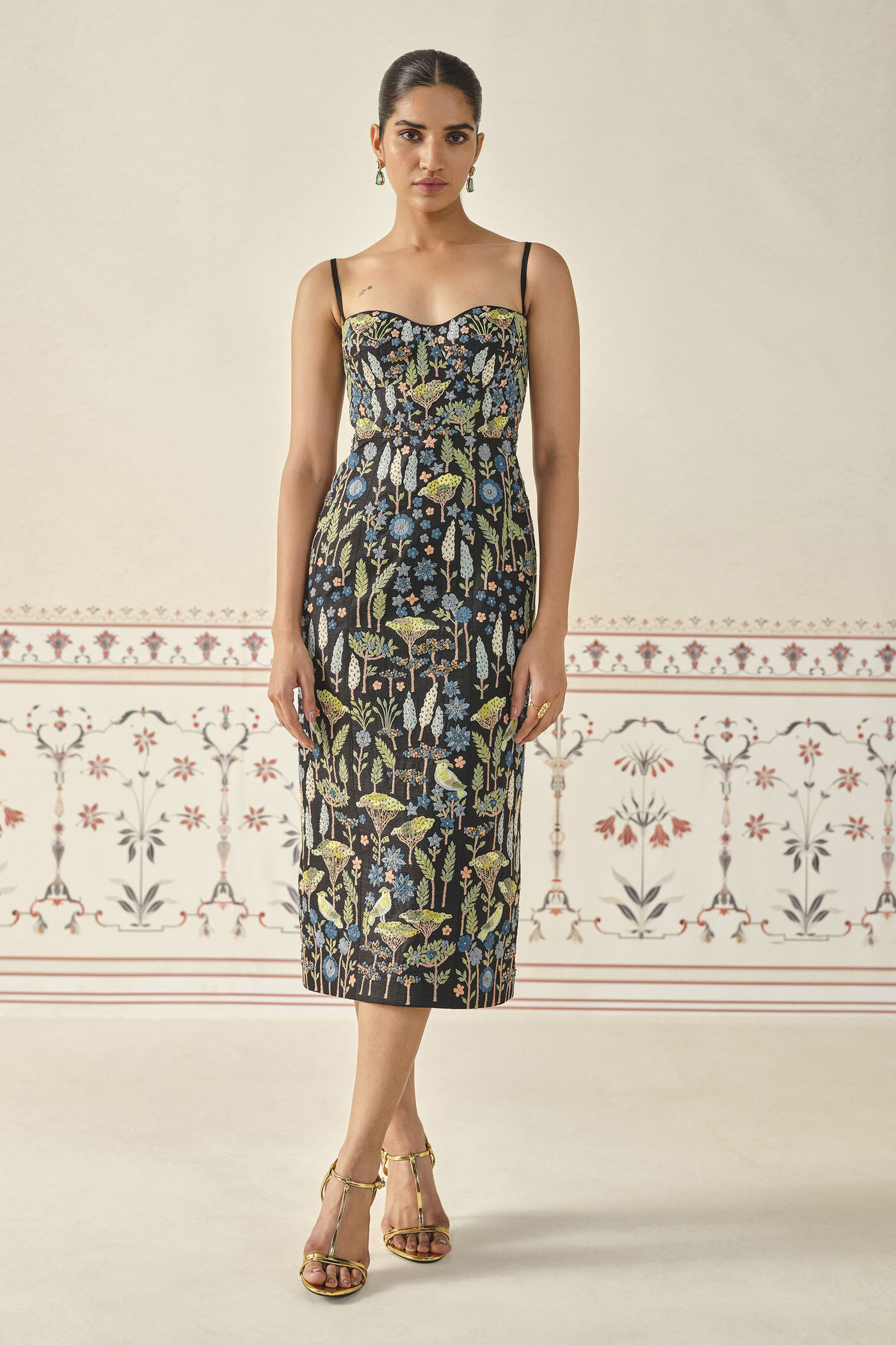 A sophisticated fusion of classic tailoring and whimsical artistry, this midnight black midi dress features a structured sweetheart bodice and a sleek silhouette meticulously adorned with a vibrant tapestry of hand-embroidered avian and forest motifs.