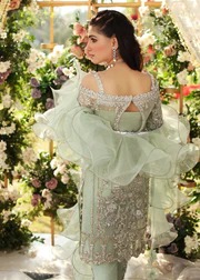 The mint green kameez is crafted from premium net fabric, enhanced with intricate Victorian floral patterns and delicately placed crystal embellishments. The silhouette is designed to offer a graceful drape and a contemporary yet regal wedding look.