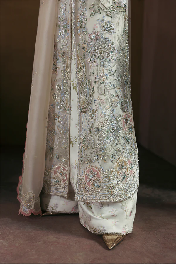Handcrafted using silver kora, naqshi, shimmering sequins, 3D floral silk threads, and pearl drops.