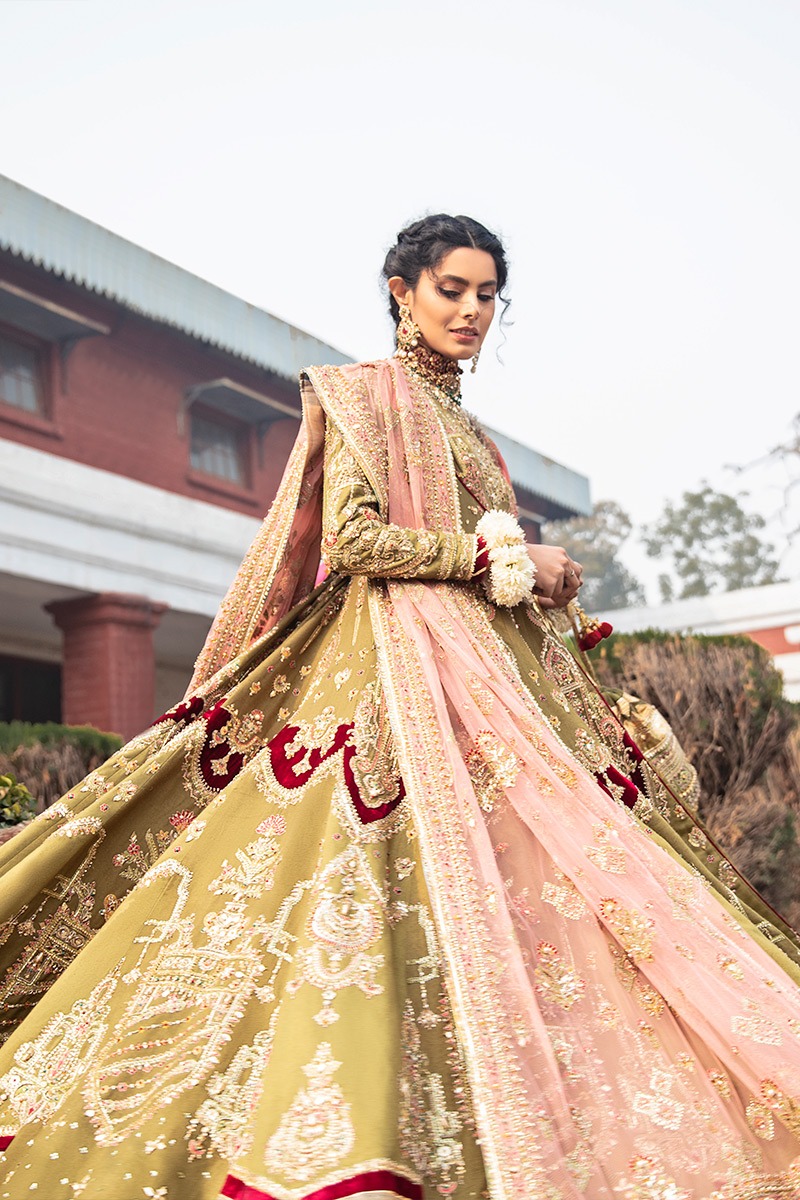 The centerpiece of this ensemble is a richly worked peshwas crafted on a moss green cotton net base. It is elevated with hand-appliquéd jamawar and velvet patches in deep rust and burgundy tones, creating a striking contrast. Lavish gota and zari embellishment flows across the silhouette, lending the outfit ceremonial richness while keeping it festive and joyful in spirit.
