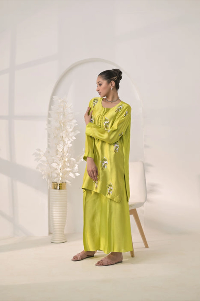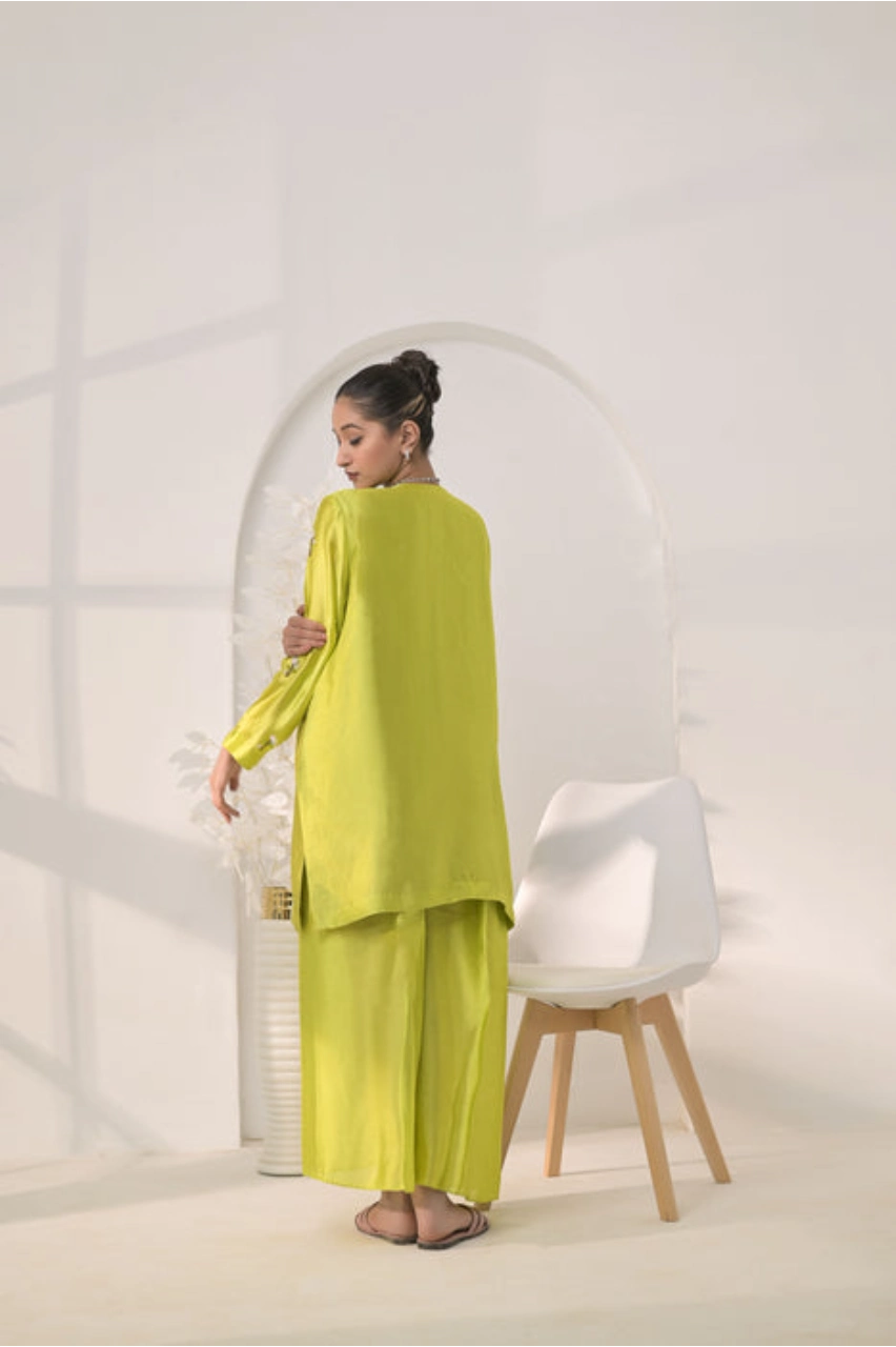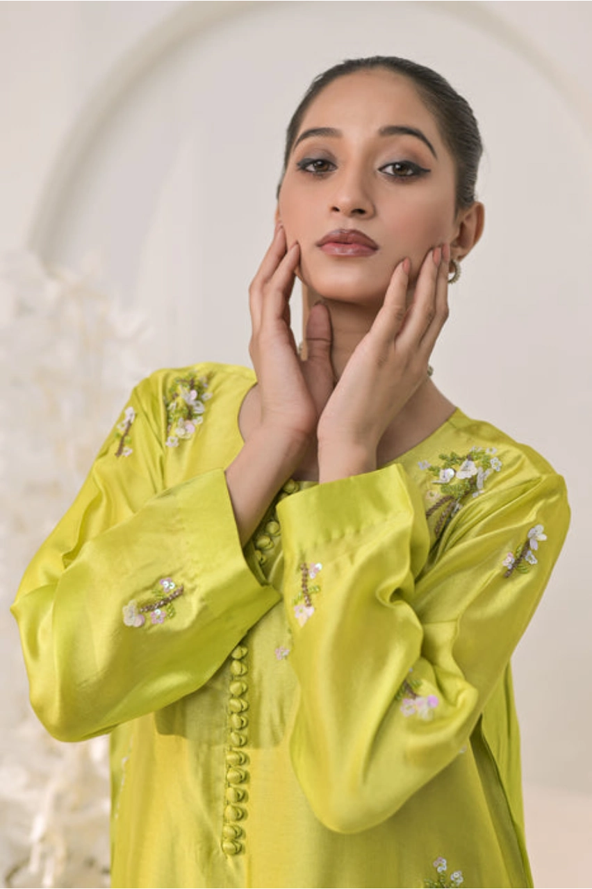 The short shirt is crafted from smooth silk and designed with a refined yet modern silhouette. Exquisite handwork embellishment featuring stones, pearls, cut dana, and fine detailing is applied with precision, adding subtle luxury to the overall design. The trendy color palette and clean tailoring enhance its fashionable appeal while maintaining comfort and elegance.