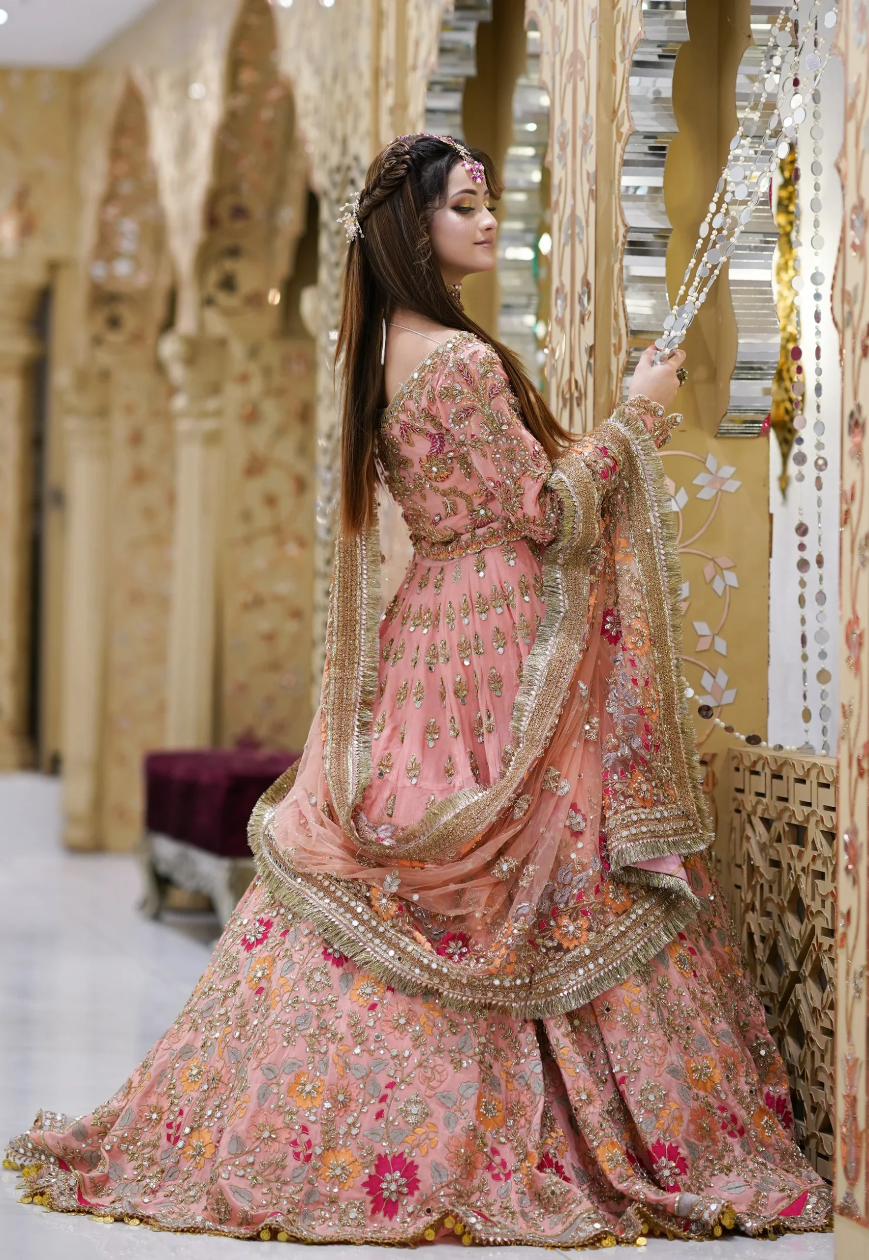 The dupatta is crafted from sheer net fabric in a matching peach pink tone, finished with a beautifully embellished border. Intricate floral motifs, mirror accents, and fine crystal detailing are delicately placed throughout, adding light-catching elegance. The refined border framing enhances the overall bridal look while maintaining a soft, airy drape.