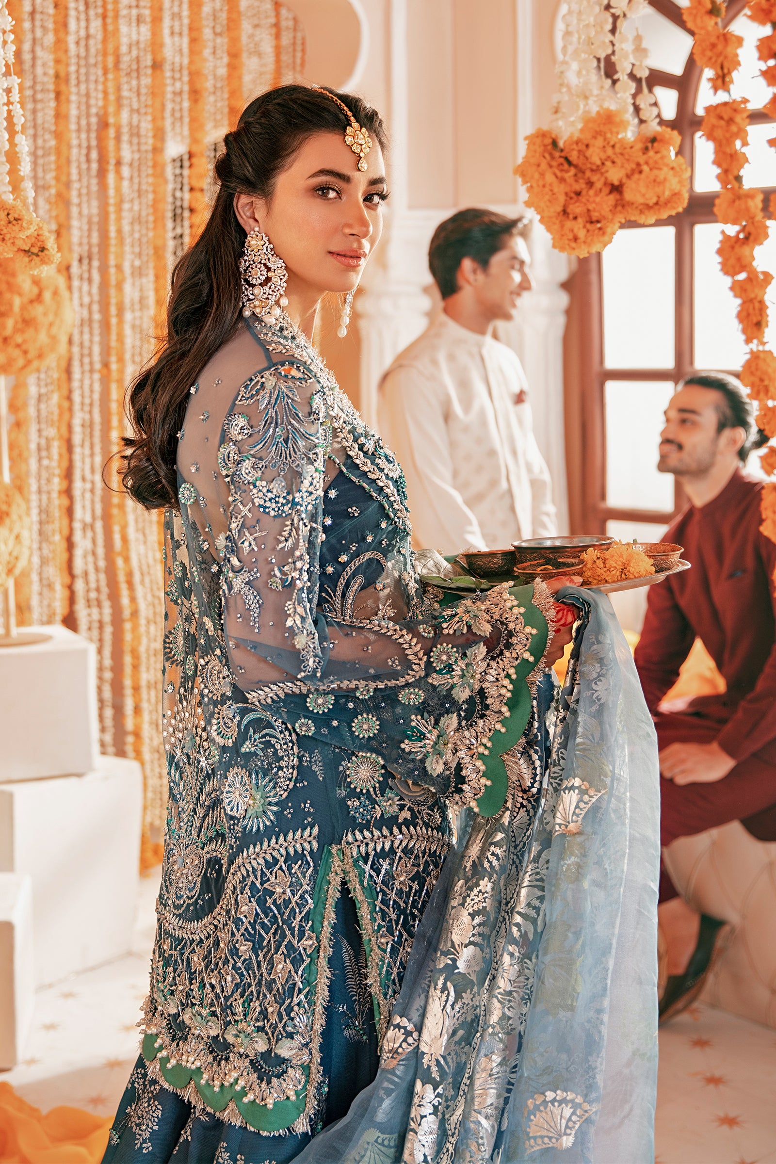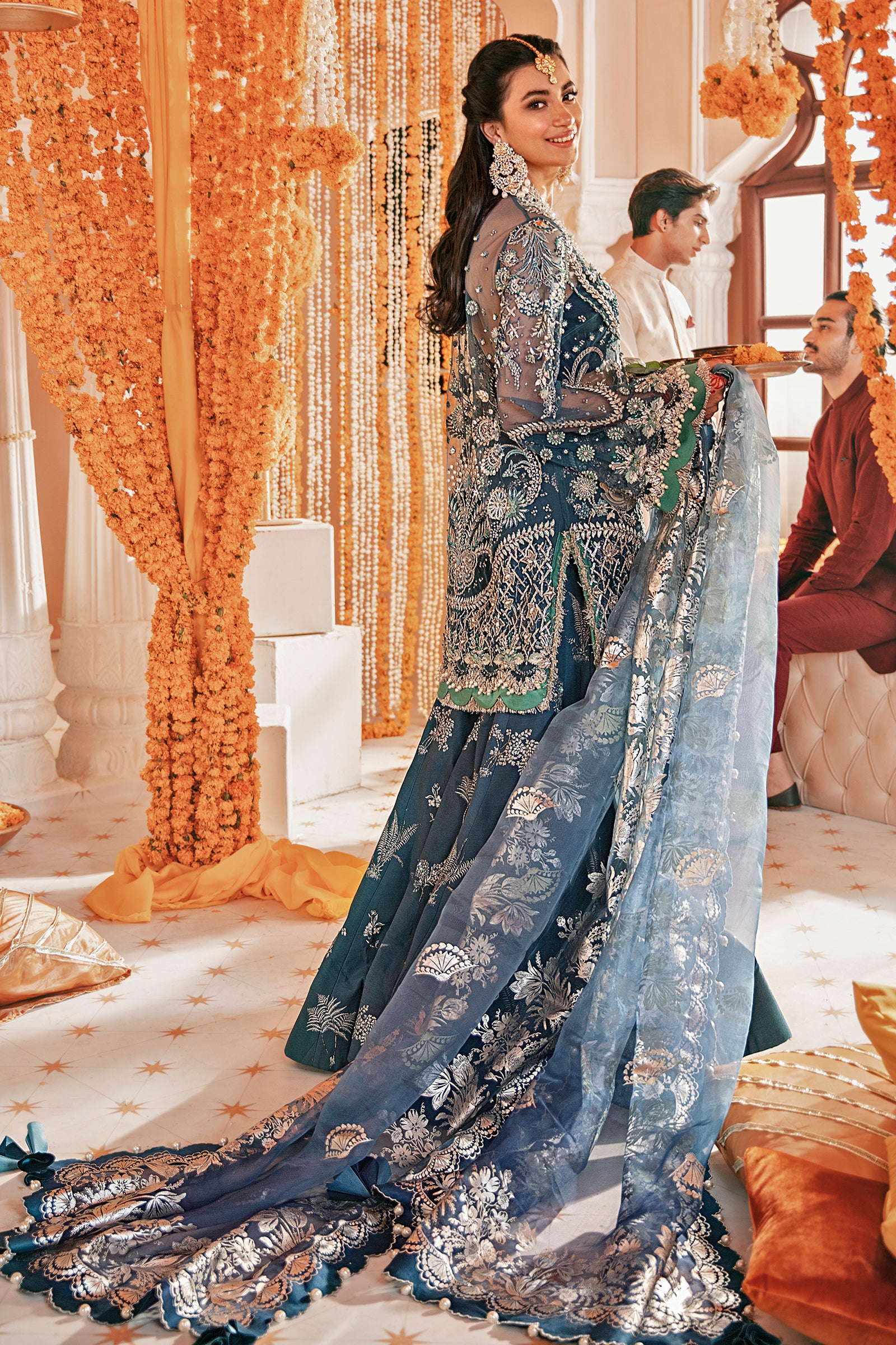 A bold teal couture ensemble designed to captivate, featuring a hand-embellished net jacket layered with shimmering silver details, paired with a raw silk sharara and an organza foil-printed dupatta.