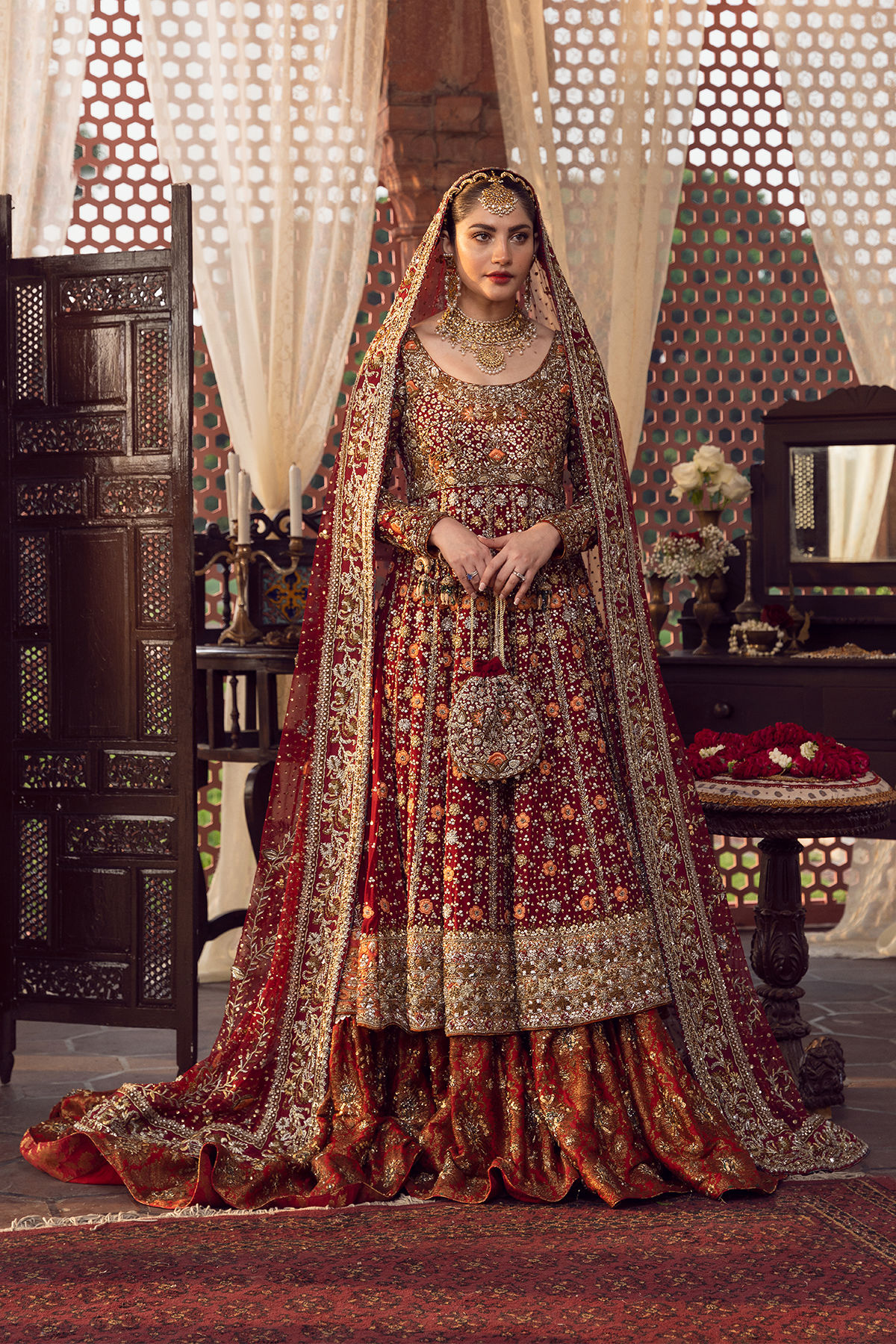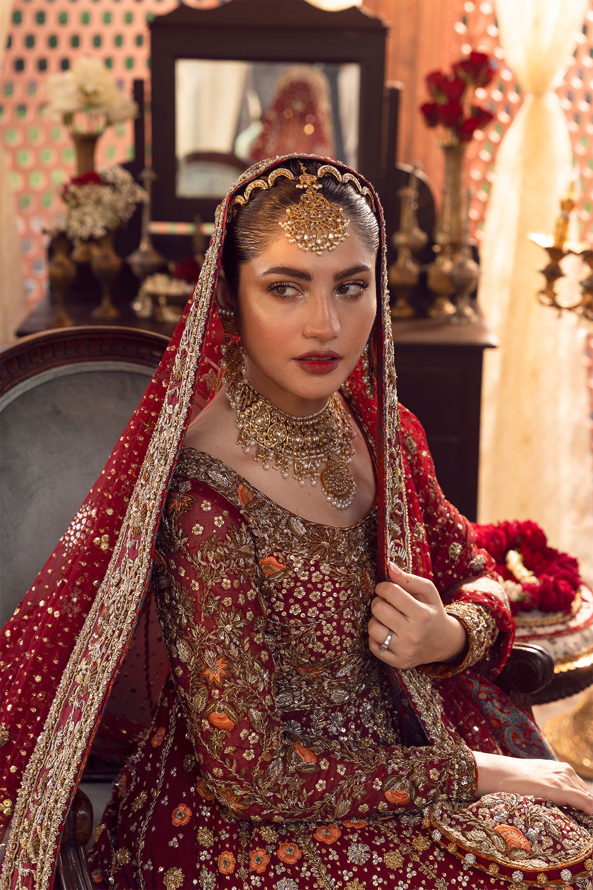 A magnificent and traditional bridal ensemble featuring a heavily hand-embellished long Peshwas/Anarkali in rich ruby red, paired with a shimmering patterned skirt, embodying classic elegance.