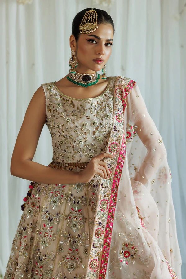 The choli is crafted from fine net and adorned with elaborate embellishment that blends traditional artistry with refined detail. Naqshi, dabka, shimmering stones, sequins, zari, and resham threads are intricately applied across the front and sleeves. Pearlescent purl motifs add a luminous charm, while playful tassels enhance the movement and richness of the design. The inner finishing offers comfort and structure, maintaining a balanced silhouette throughout.
