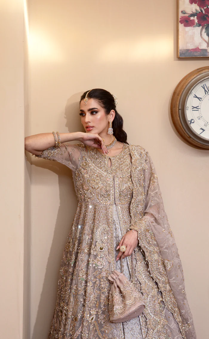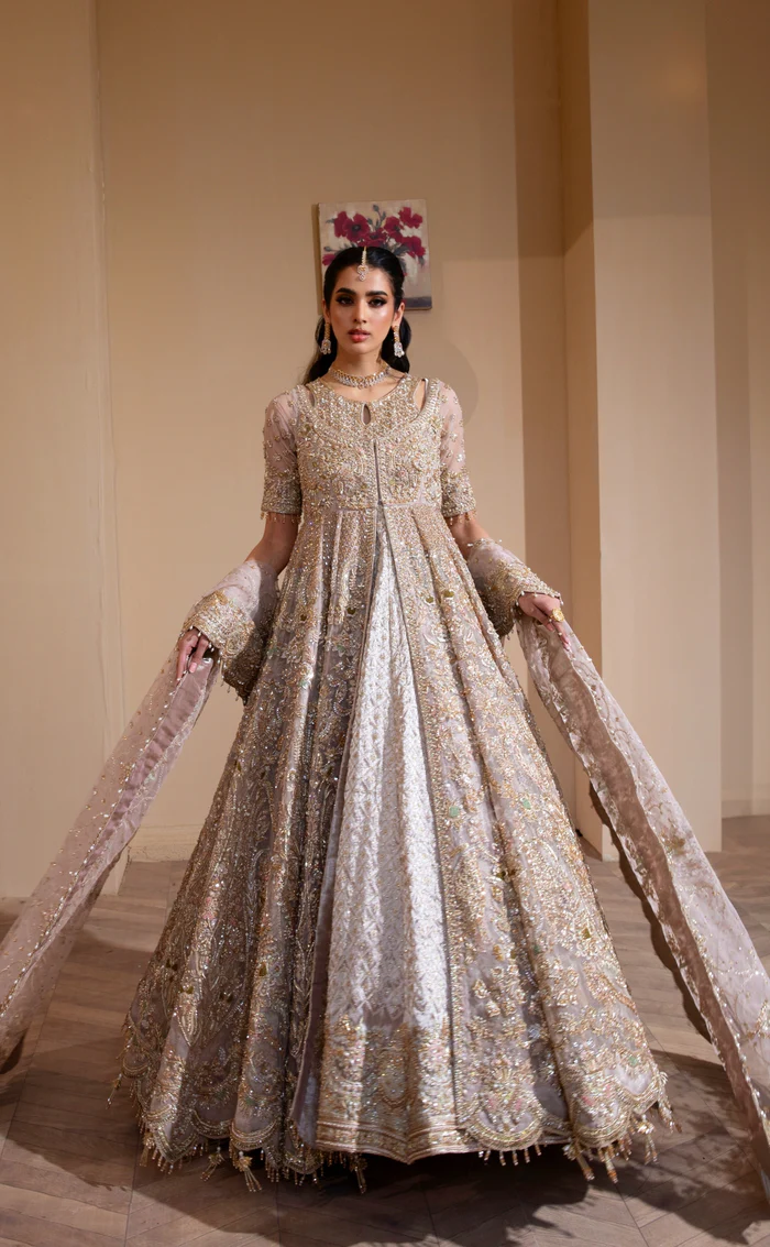 The gown and dupatta are made from premium pure organza, while the underdress is crafted from embroidered raw silk for comfort, structure, and luxury.