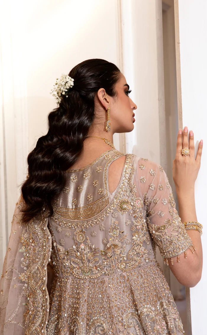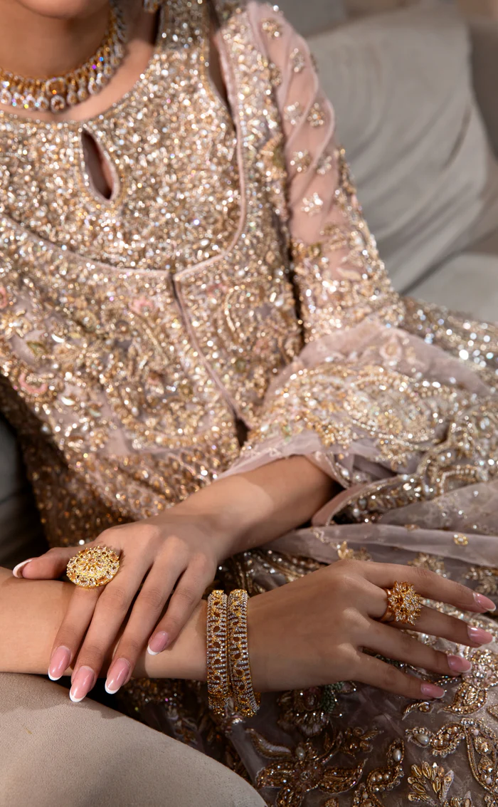 Nude peach, a serene and versatile shade, accentuated with sparkling hand-embellished embroidery for a radiant and sophisticated appearance.