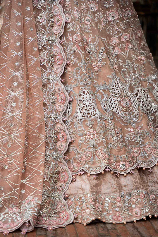 The lehenga is tailored from luxurious kamkhwab fabric, offering a graceful and flowing silhouette. Embellishments echo the motifs on the frock, combining 3D floral accents with sparkling stones and pearls to create a harmonious, opulent look. The hem is neatly finished for a seamless drape.