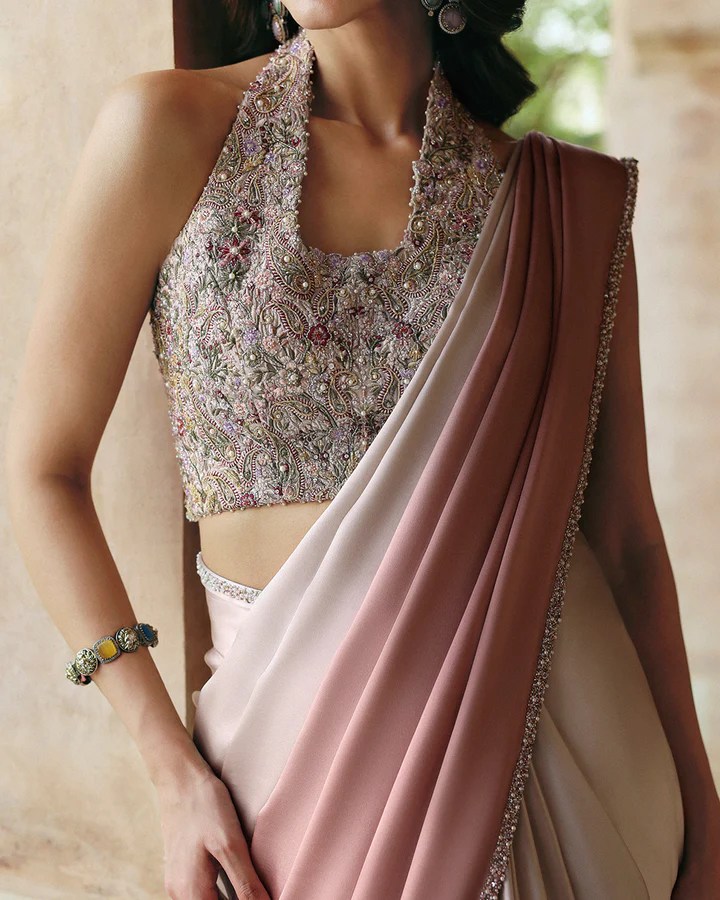 The saree is crafted with embellishment that complements the detailed blouse. Its soft drape flows beautifully, enhancing the ombré aesthetic with a refined sheen. The subtle adornments distributed across the saree create a cohesive and elegant look suitable for festive, formal, and evening wear.