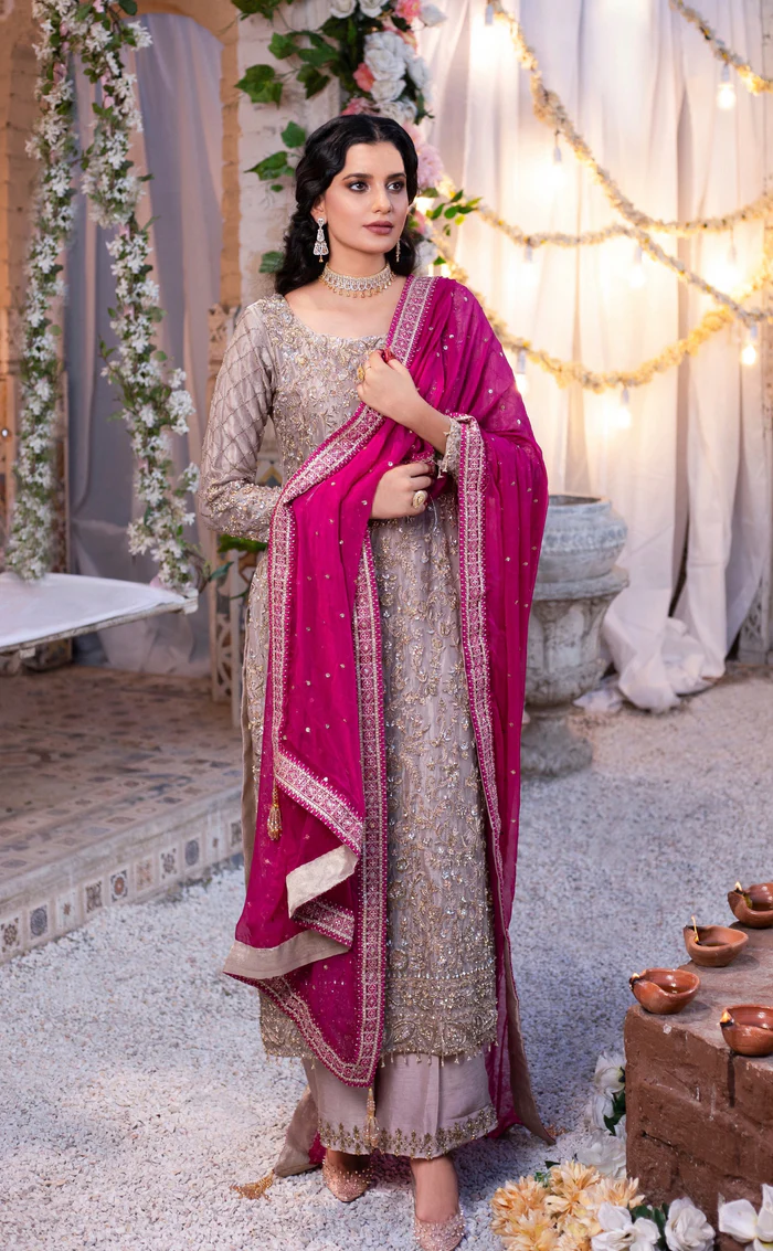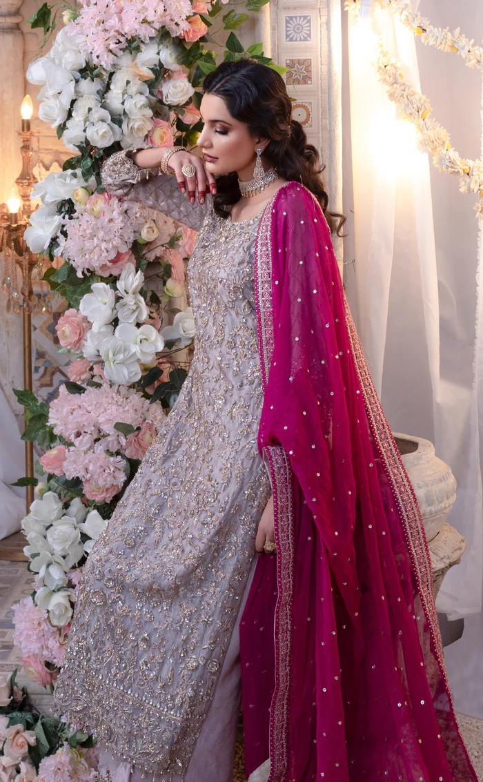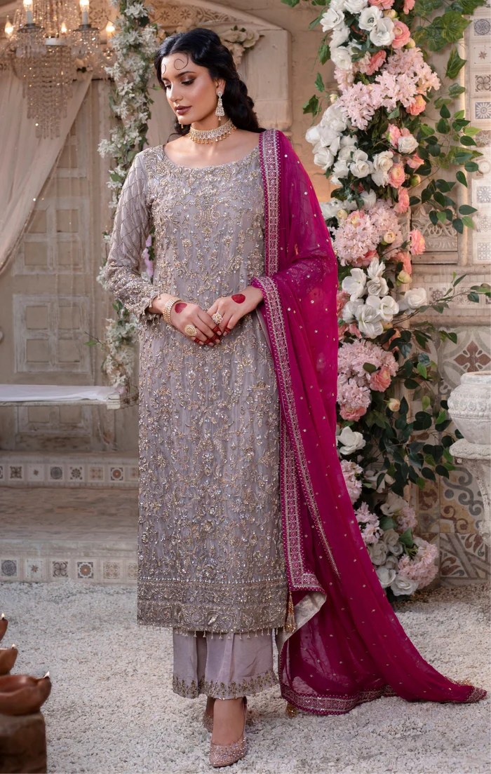 A stunning onion pink ensemble featuring a hand-embroidered sheer zari tissue shirt, luxurious raw silk trouser, and a vibrant magenta chiffon dupatta, crafted for elegance and timeless charm.