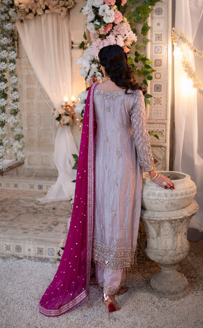 The shirt is made from sheer zari tissue, the trouser from raw silk, and the dupatta from premium chiffon. Lining is included to ensure comfort and flawless wear.