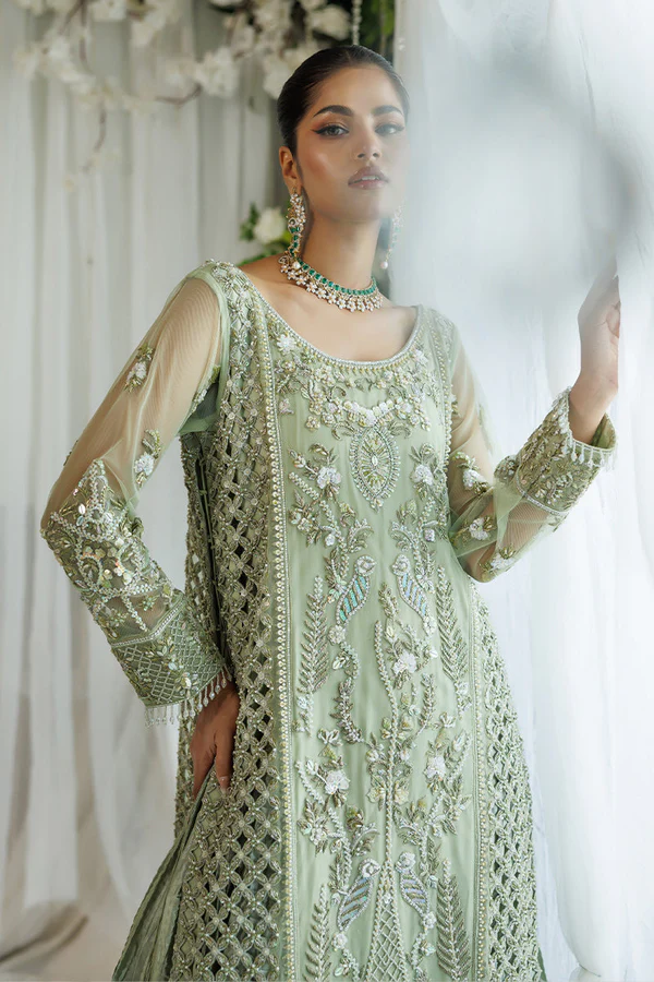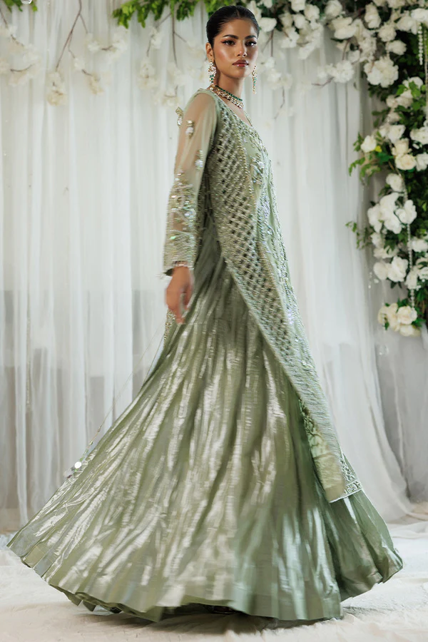 The gown is crafted from green net and features detailed cutwork that forms an elegant and contemporary silhouette. It is adorned with naqshi, dabka, qora, sequins, tikky stones, pearl moti, floral sequences, and charming tassels, creating a multi-dimensional and luxurious surface. The inner layer is made from lama crush fabric, adding depth, texture, and a graceful fall to the overall structure. Every element is finished with care to ensure comfort and sophistication.