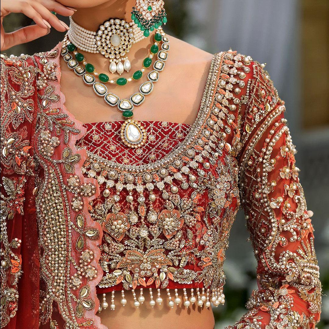 The maroon-red choli is a true work of art, crafted to make a powerful bridal statement. Designed on a delicate net base with silk lining, it is lavishly hand-embellished using tilla dabka, kora kundan, naqshi, pearls, stones, and refined zardozi work. The intricate patterns blend floral and geometric motifs, creating depth, richness, and unmatched opulence. Every detail reflects expert craftsmanship and bridal grandeur.