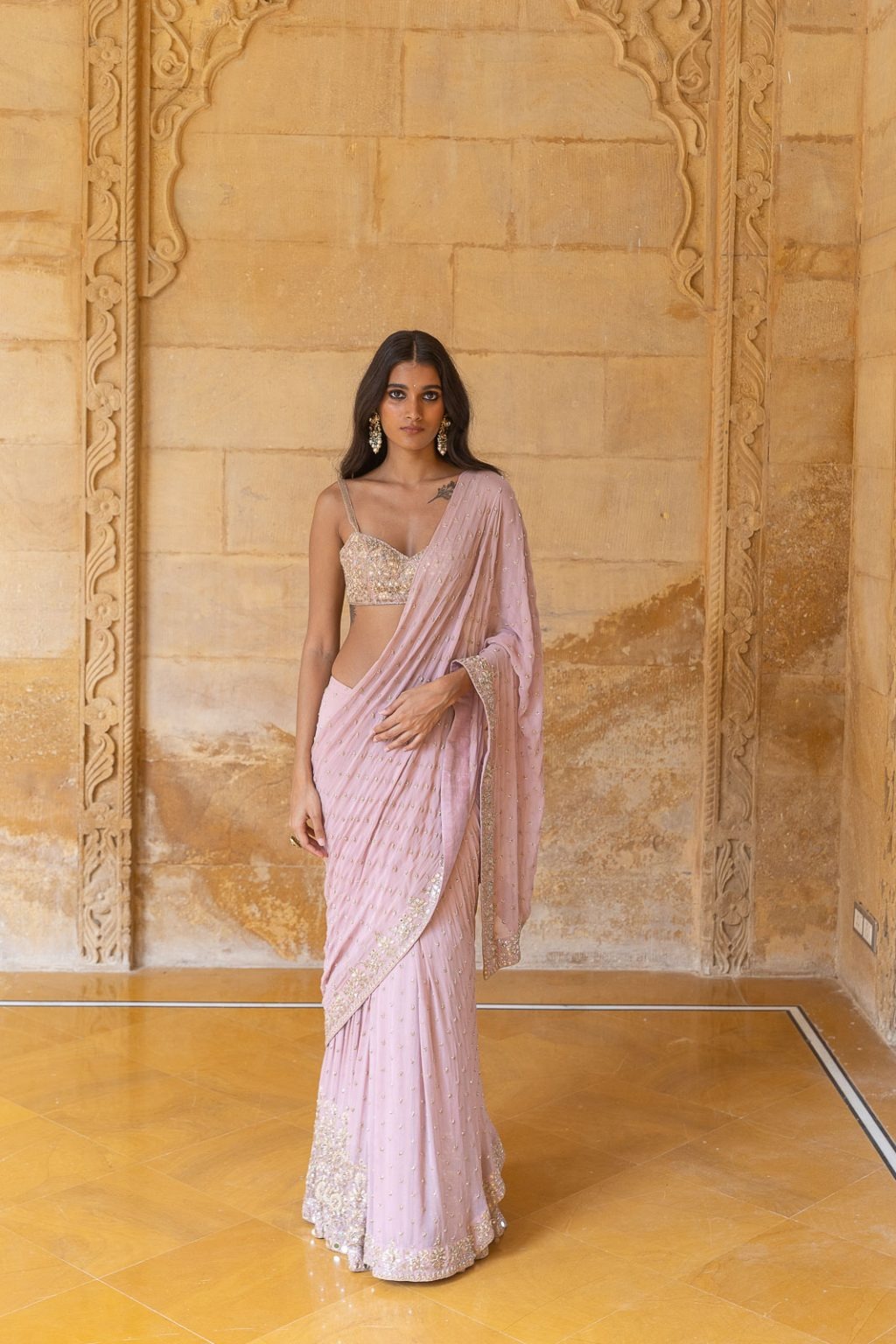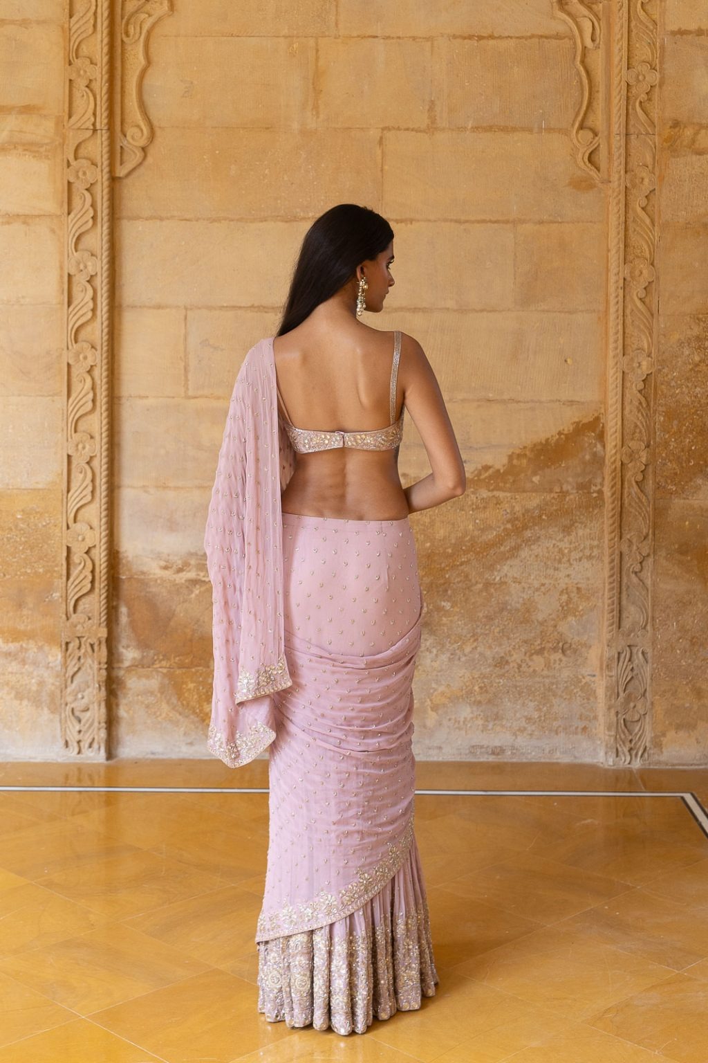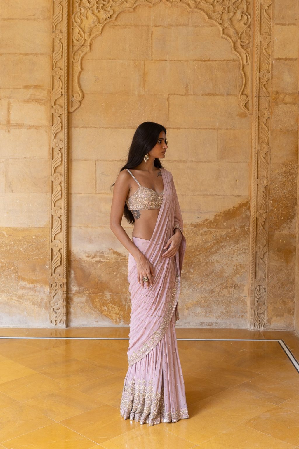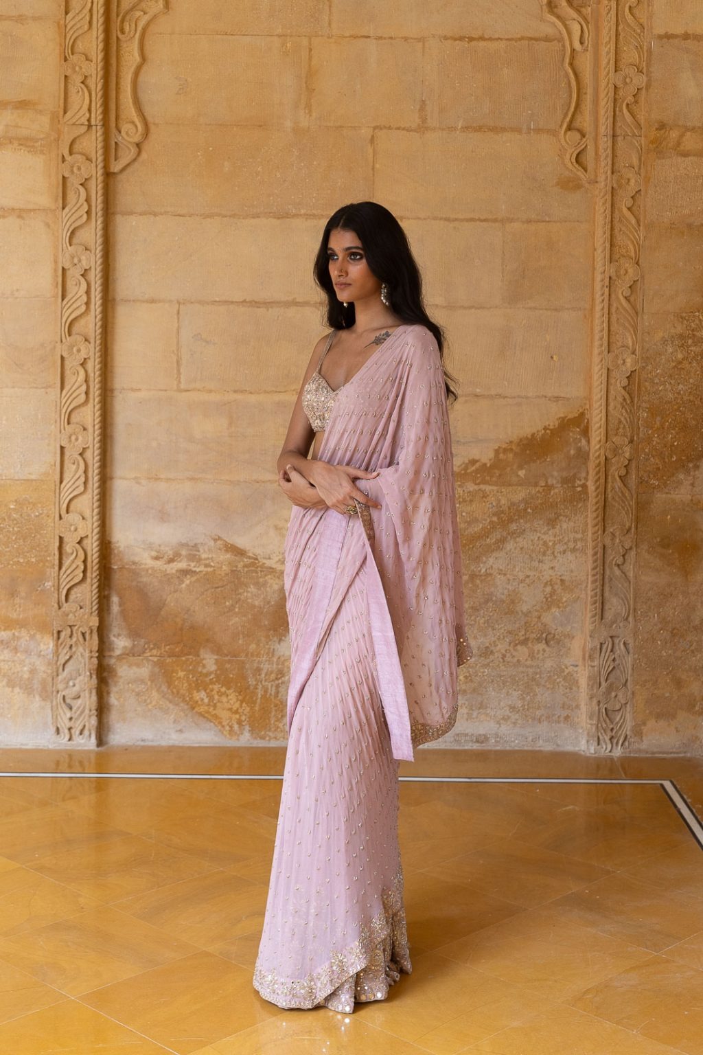 A baby orchid-inspired georgette sari set featuring delicate mirror and thread hand embroidery, designed to exude grace and contemporary charm.