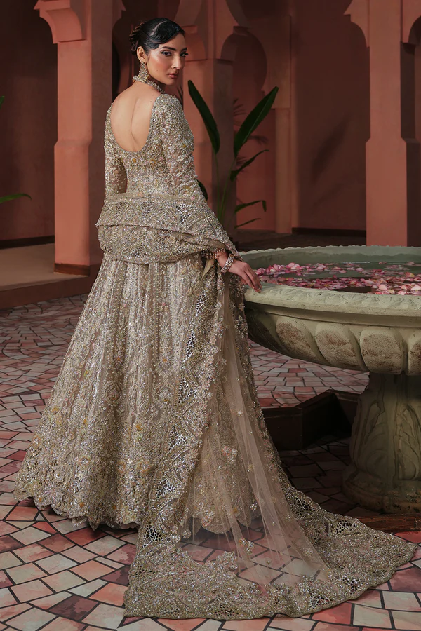 A luxurious bridal creation in soft peach pink and aqua tones, featuring a tissue fabric gown with intricate cutwork, dabka, and fine hand embellishments, paired with a sheer net dupatta for an ethereal, elegant look.