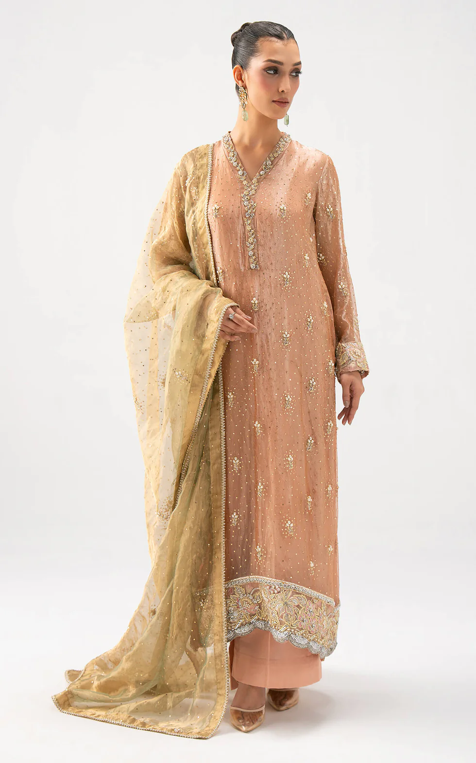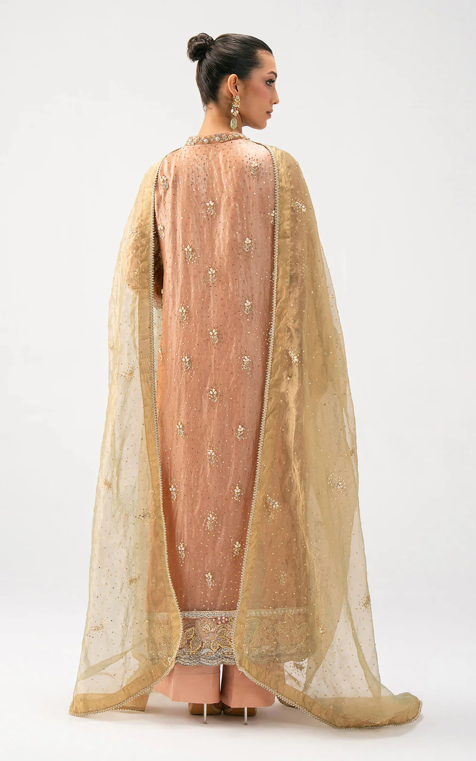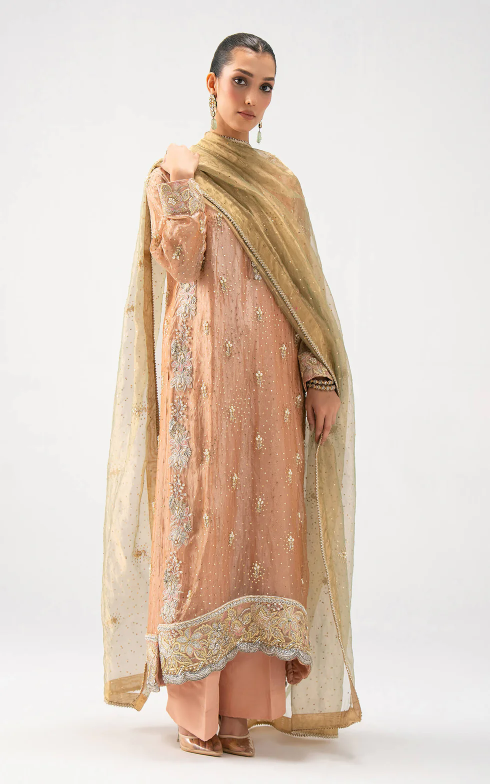 This exquisite three-piece ensemble in a serene peach hue features intricate hand-embellishment on a flowing straight-cut silhouette, perfectly paired with a contrasting antique gold dupatta.