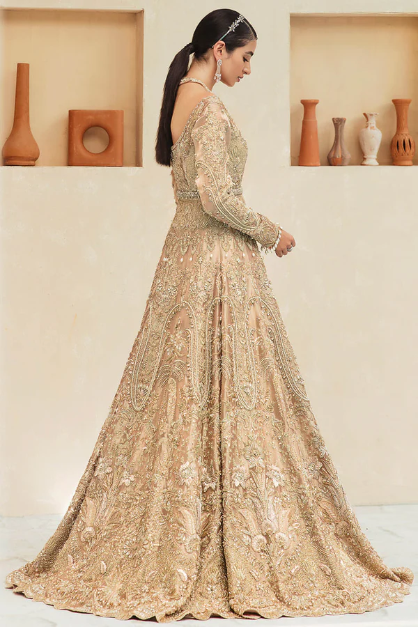 This mandatory couture masterpiece is crafted as an open-style tissue gown bathed in luminous peachy-gold tones. The silhouette is brought to life with dazzling handcrafted details of makesh, gotta, and fine threadwork, lavishly enriched with pearls and cut dana embellishments. Each motif reflects the exceptional skill of our artisans, creating a radiant surface that captures light with every movement while exuding old-world opulence blended with modern bridal elegance.