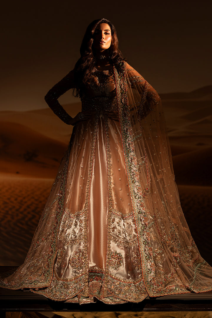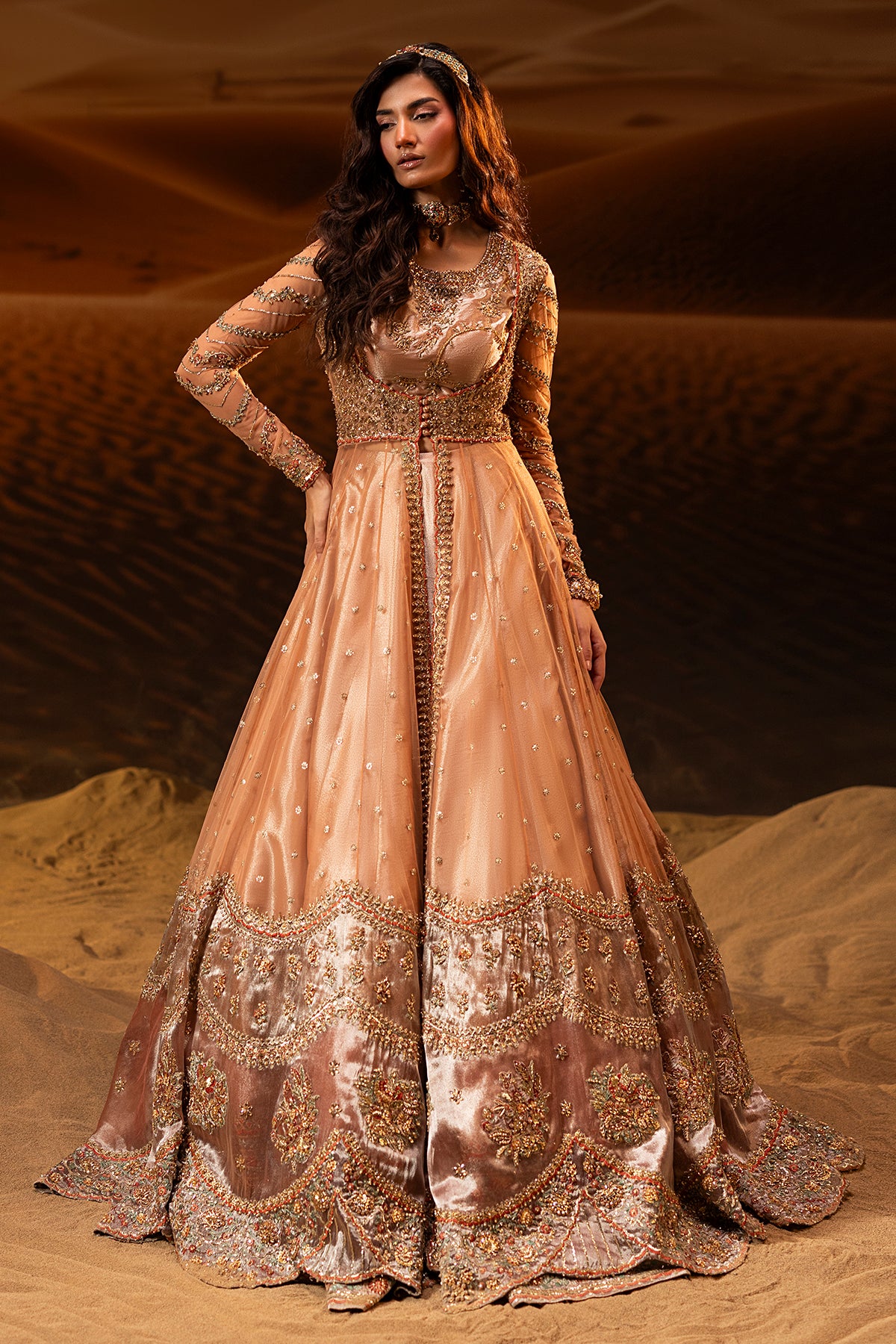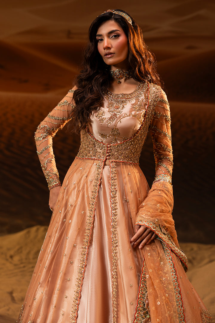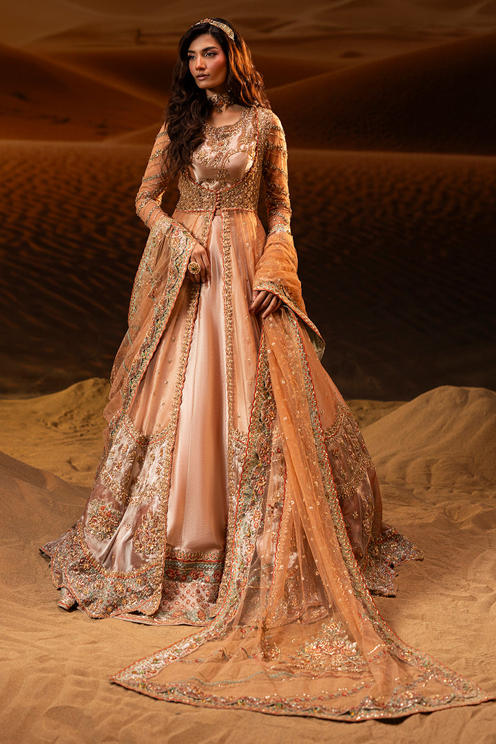 A graceful peach blush pishwas paired with a flowing lehenga, adorned with intricate zardozi and Swarovski embellishments. Finished with soft tissue borders, this ensemble blends timeless tradition with refined modern elegance.
