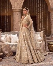 A luxurious net lehenga choli featuring intricate zardozi, pearls, and hand-cut sequins, paired with a tulle dupatta for a timeless and opulent bridal statement.