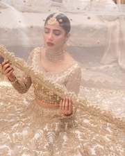 The choli complements the lehenga with delicate hand-embellished bootis of dabka and tilla, finished with pearl droplets that add shimmer and refinement. Its tailored structure ensures both comfort and style while maintaining a polished and sophisticated look.