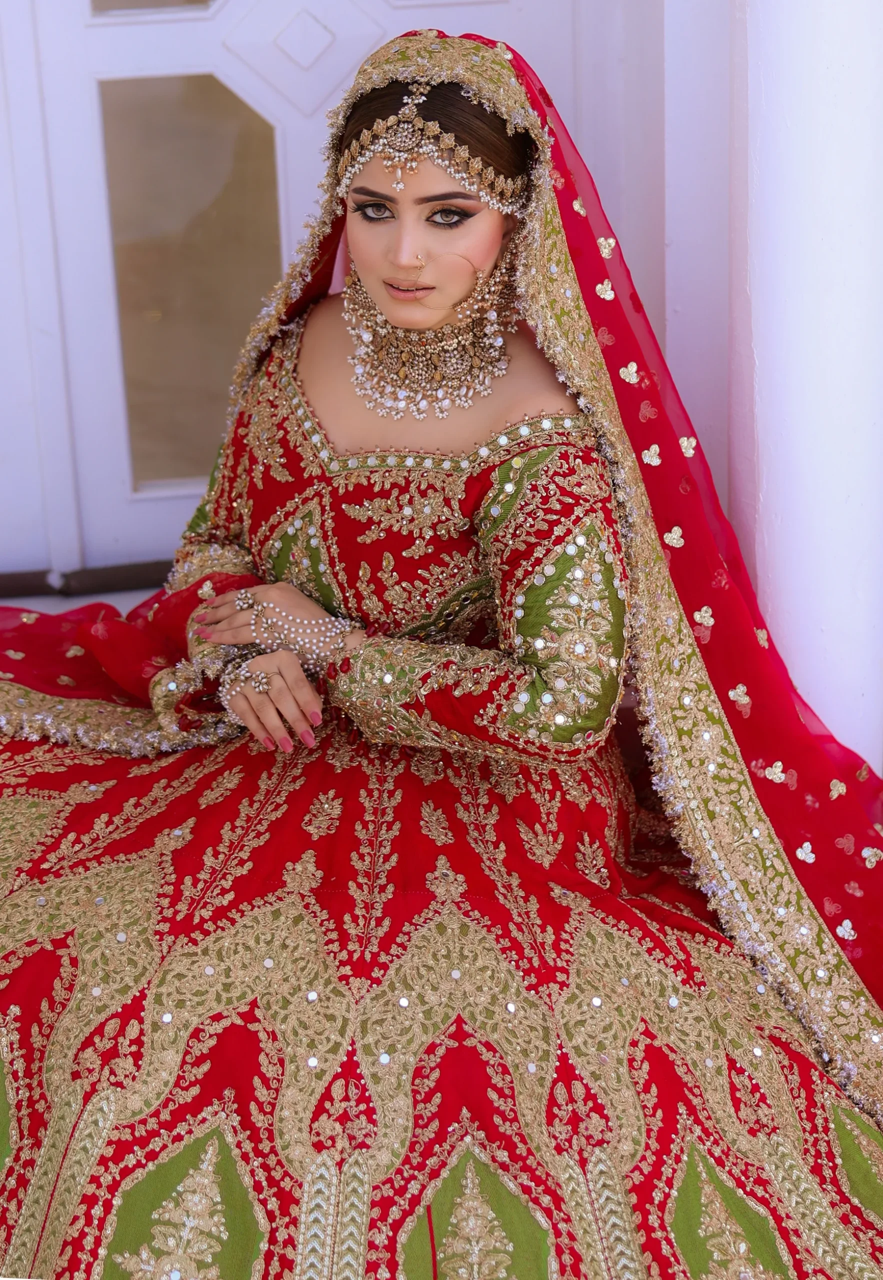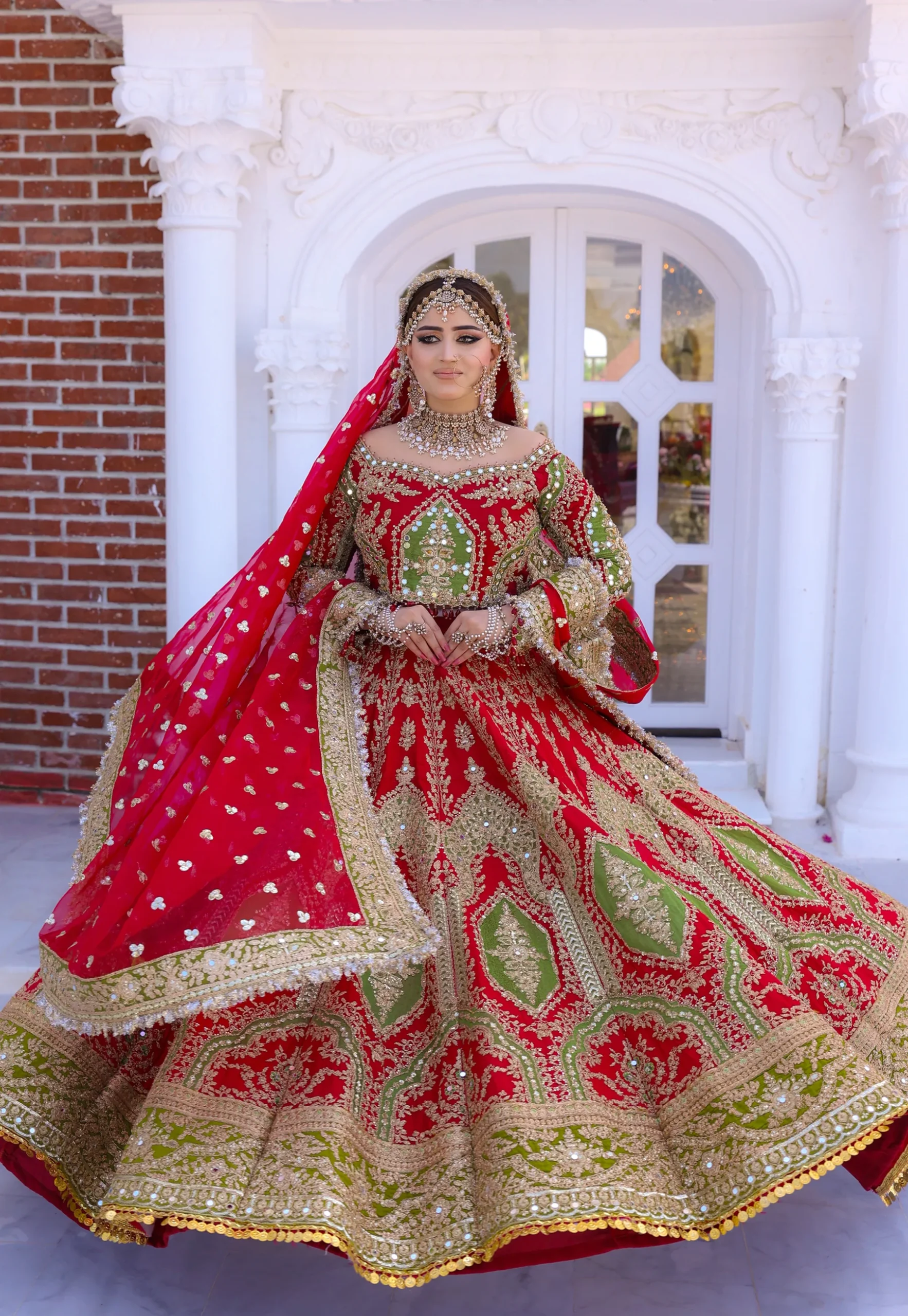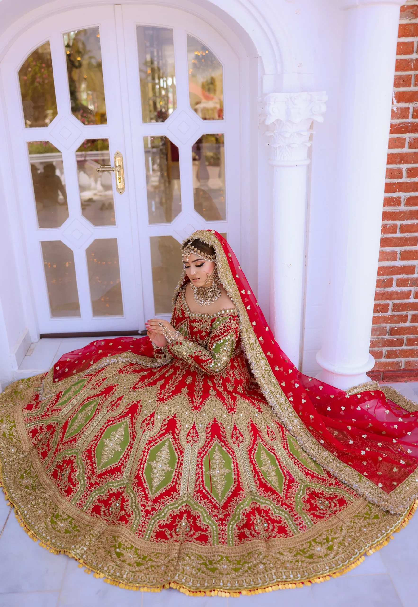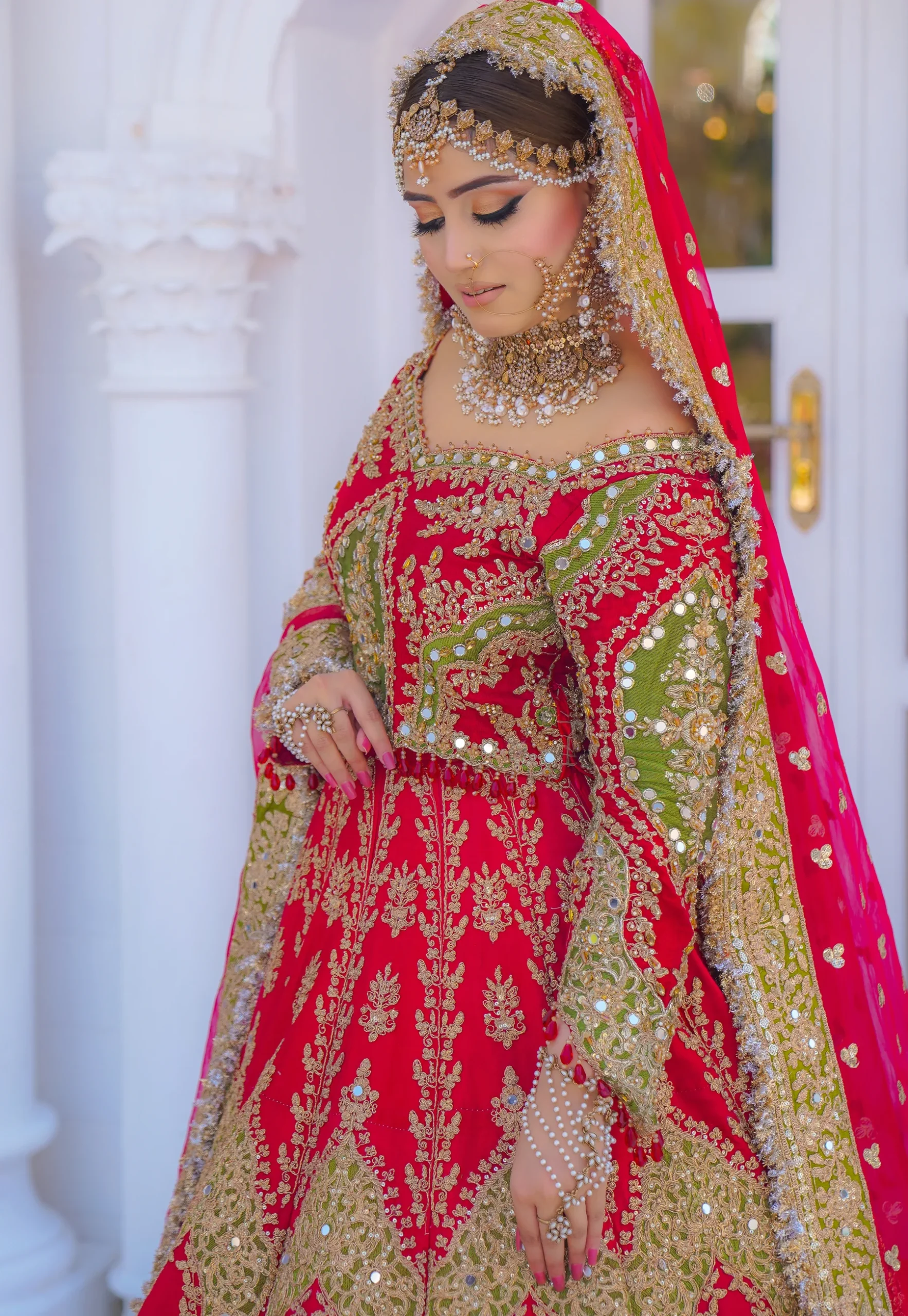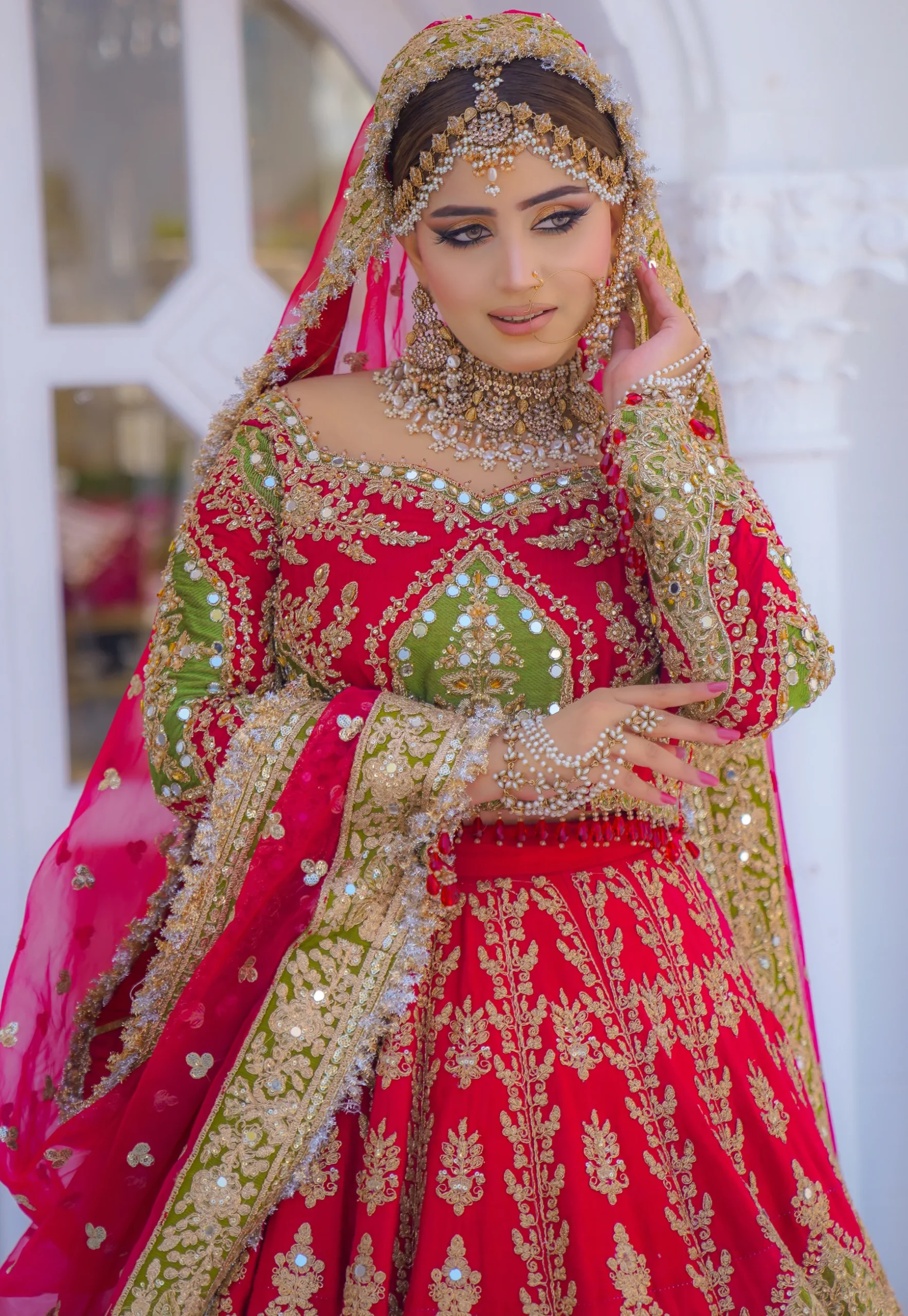 A regal bridal lehenga in pink, mehndi green, and silver hues, exquisitely hand-embellished with intricate embroidery and shimmering accents, finished with a majestic dupatta for timeless elegance.