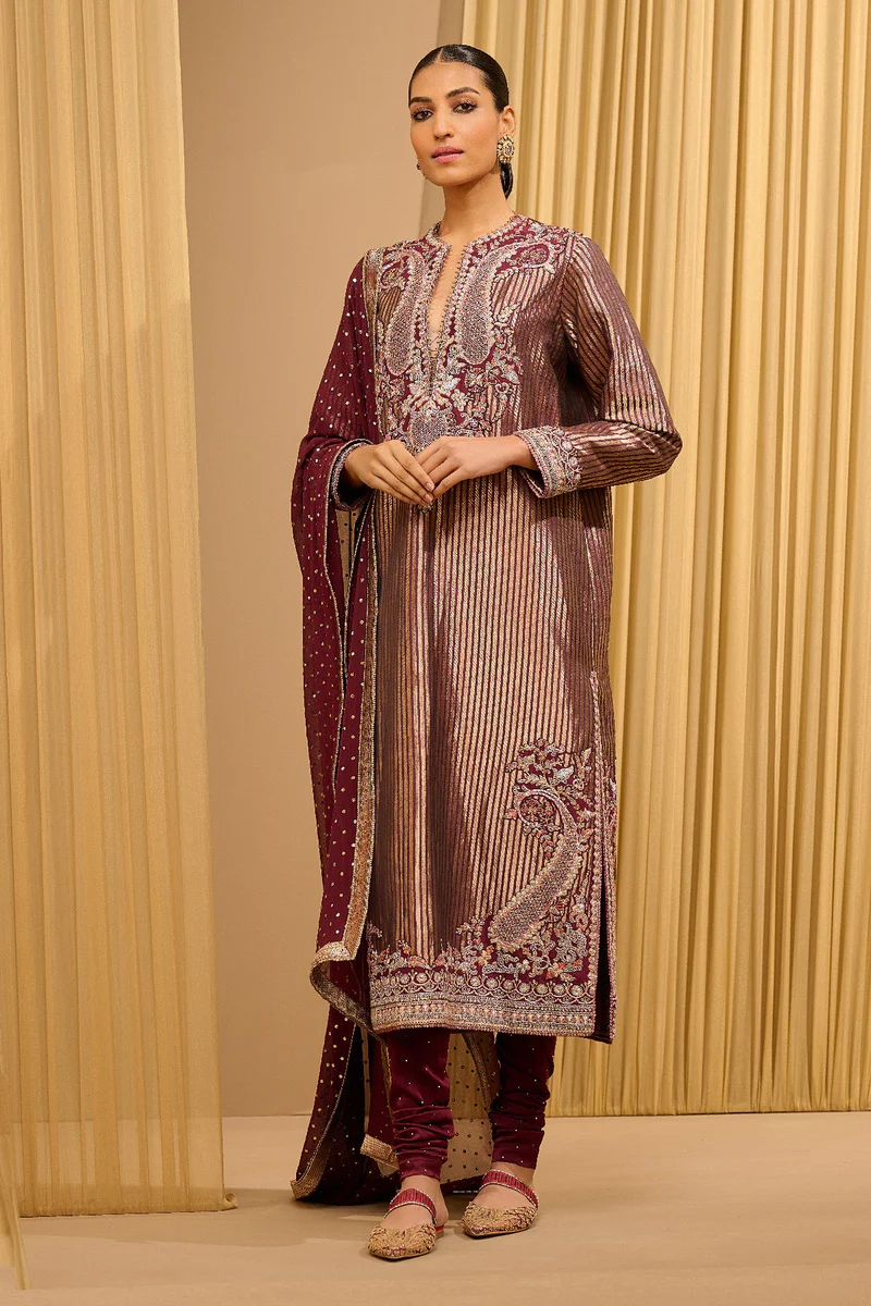 The top is designed as an elongated straight-cut kurta silhouette. Its split neckline and front placket are highlighted with ornate golden and silver embroidery that creates a striking contrast against the deep plum base. The fabric features a shimmering pinstripe texture throughout the surface, while the side slits and hem carry dense, handcrafted decorative motifs for added refinement. The sleeves are finished with matching embroidered cuffs, enhancing the opulent character of the ensemble.