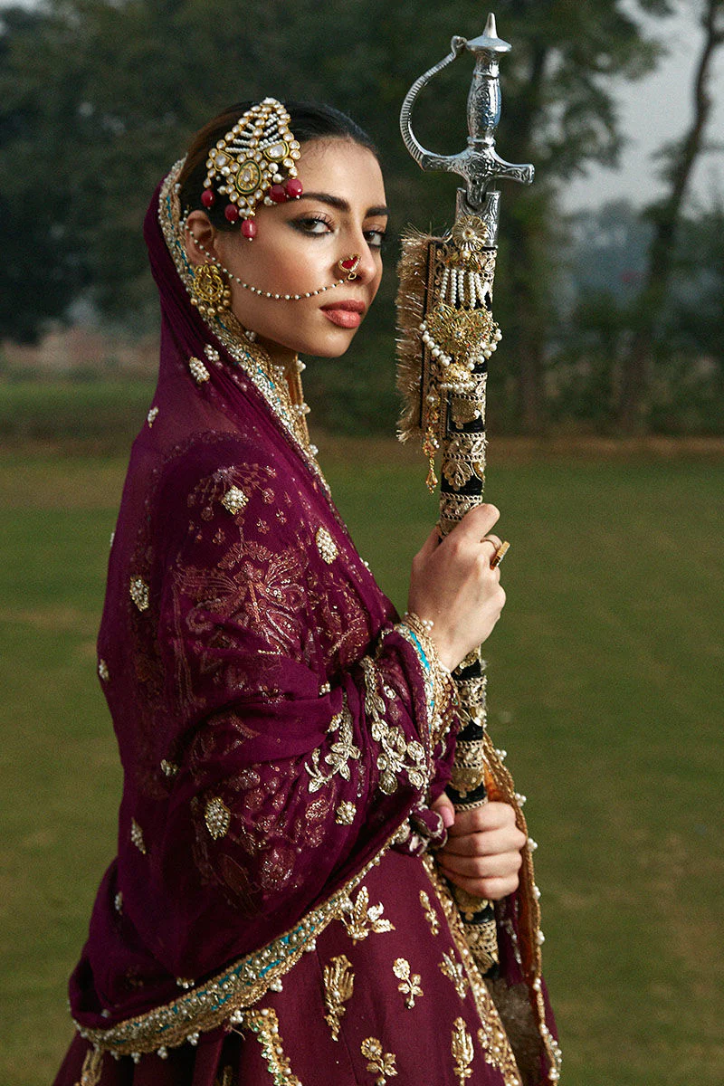 A luxurious deep plum bridal ensemble featuring a richly embellished raw silk pishwas, matching lehenga, and a pure chiffon dupatta adorned with intricate adda work and statement borders for a regal, couture finish.