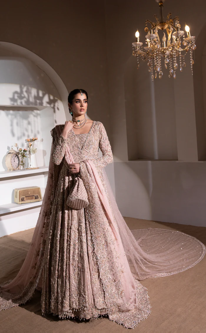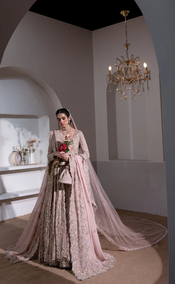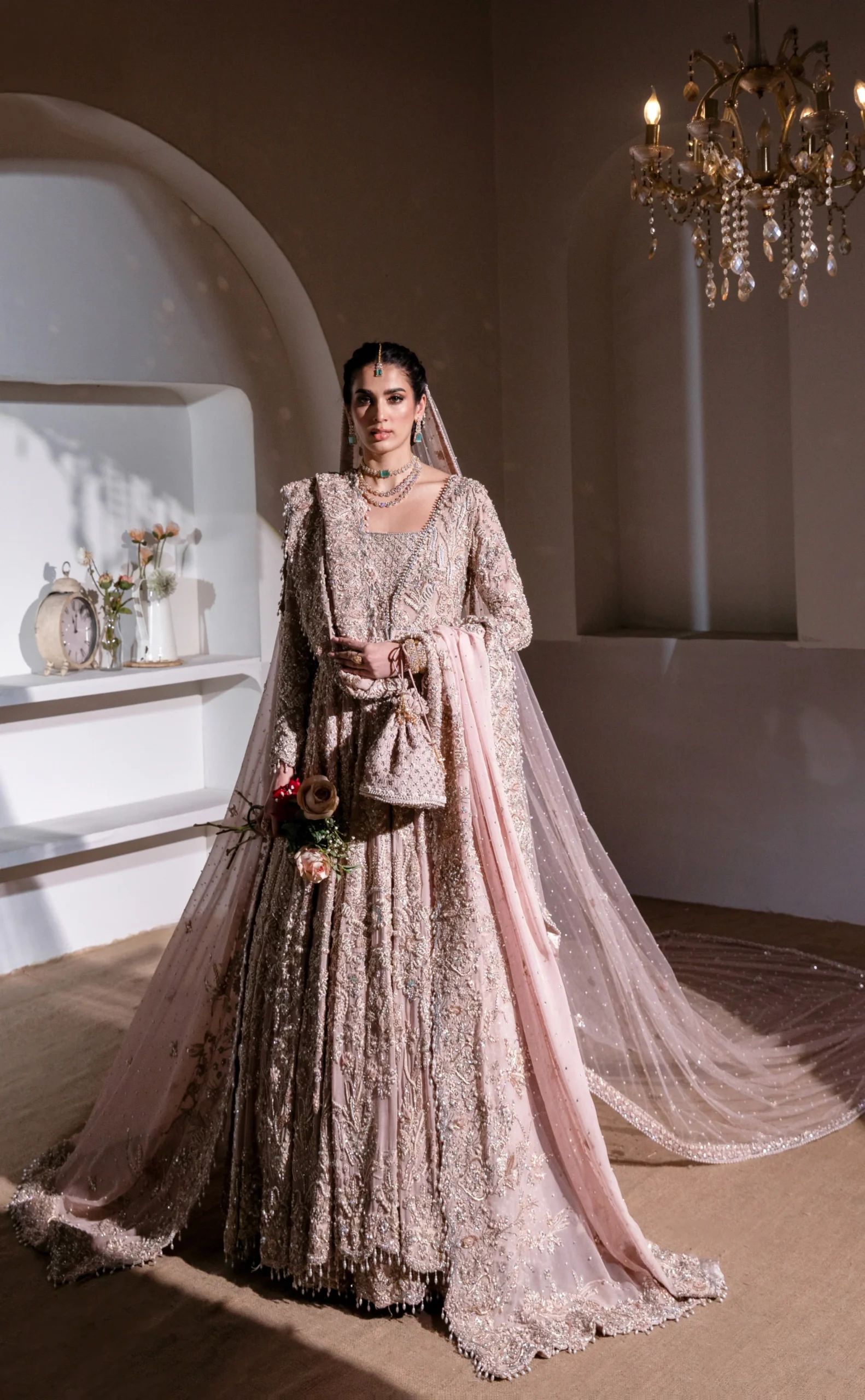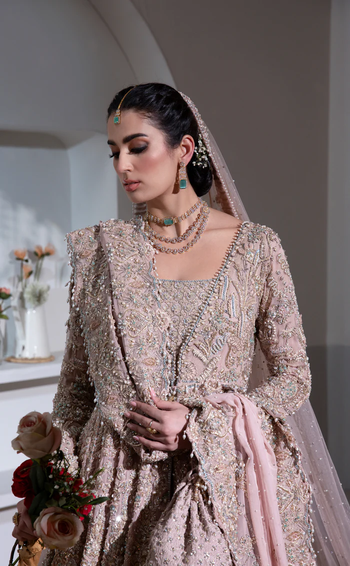 The ensemble is completed with a dupatta crafted from net and chiffon, harmonizing with the powder pink tones of the gown. The dupatta features subtle embellishments and a delicate border, enhancing the overall regal aesthetic while allowing for graceful draping.