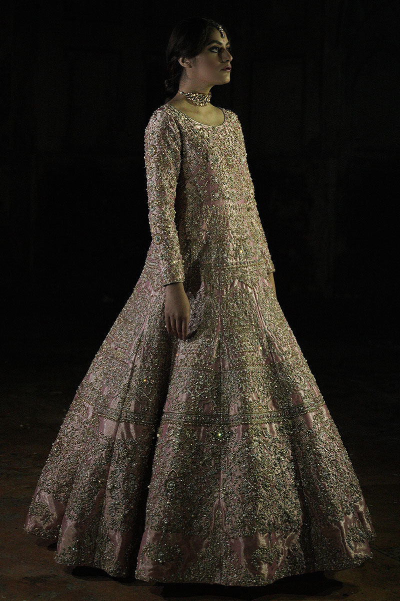 The bridal frock is designed in a soft powder pink tone, shaped as a one-piece silhouette that flows gracefully. Gold and silver threadwork is interwoven across the bodice and panels, creating an enchanting shimmer. Hand-applied kora and dabka add depth and texture, bringing out the richness of the design. The detailing highlights the bride’s elegance while maintaining a soft, ethereal charm.