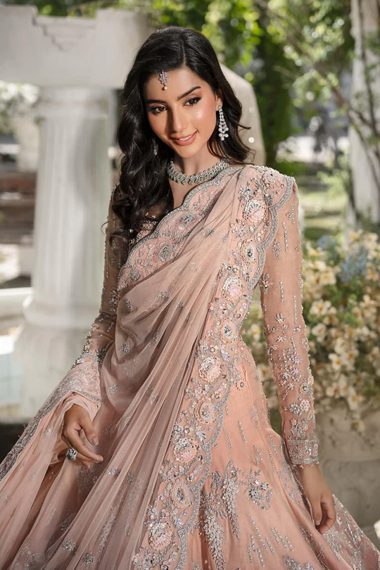 Mirror work, sculpted florals, pearls, and dabka naqshi applied with precision to create a luxurious and opulent visual appeal.
