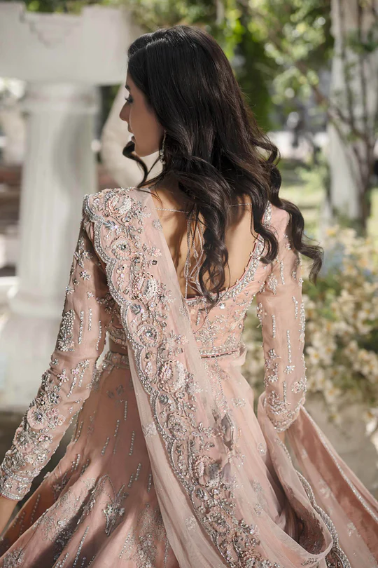The blouse is crafted from pure organza in a soft powder pink shade, featuring delicate mirror work, sculpted floral motifs, pearls, and subtle dabka naqshi accents. The lightweight structure ensures comfort while maintaining an elegant and sophisticated silhouette, perfect for a statement bridal or formal look.