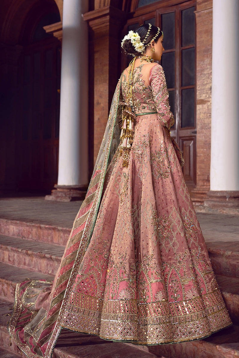 The choli is crafted from luminous tissue fabric in a delicate asmaani gulabi shade. It is thoughtfully composed with hand embellishment using gotta, sheeshagari, dabka, pearls, and resham embroidery. The detailing is refined yet rich, creating a graceful balance between softness and ceremonial grandeur.