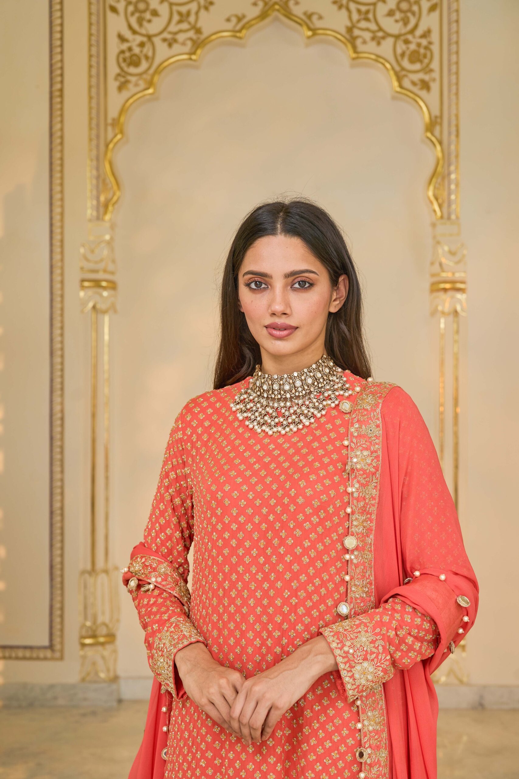 The long kurta is crafted in a rich warm coral shade, complemented by soft golden accents. Its surface features intricate handwork that brings texture, depth, and elegance to the silhouette. The balanced detailing ensures a graceful finish suitable for festive and wedding occasions.