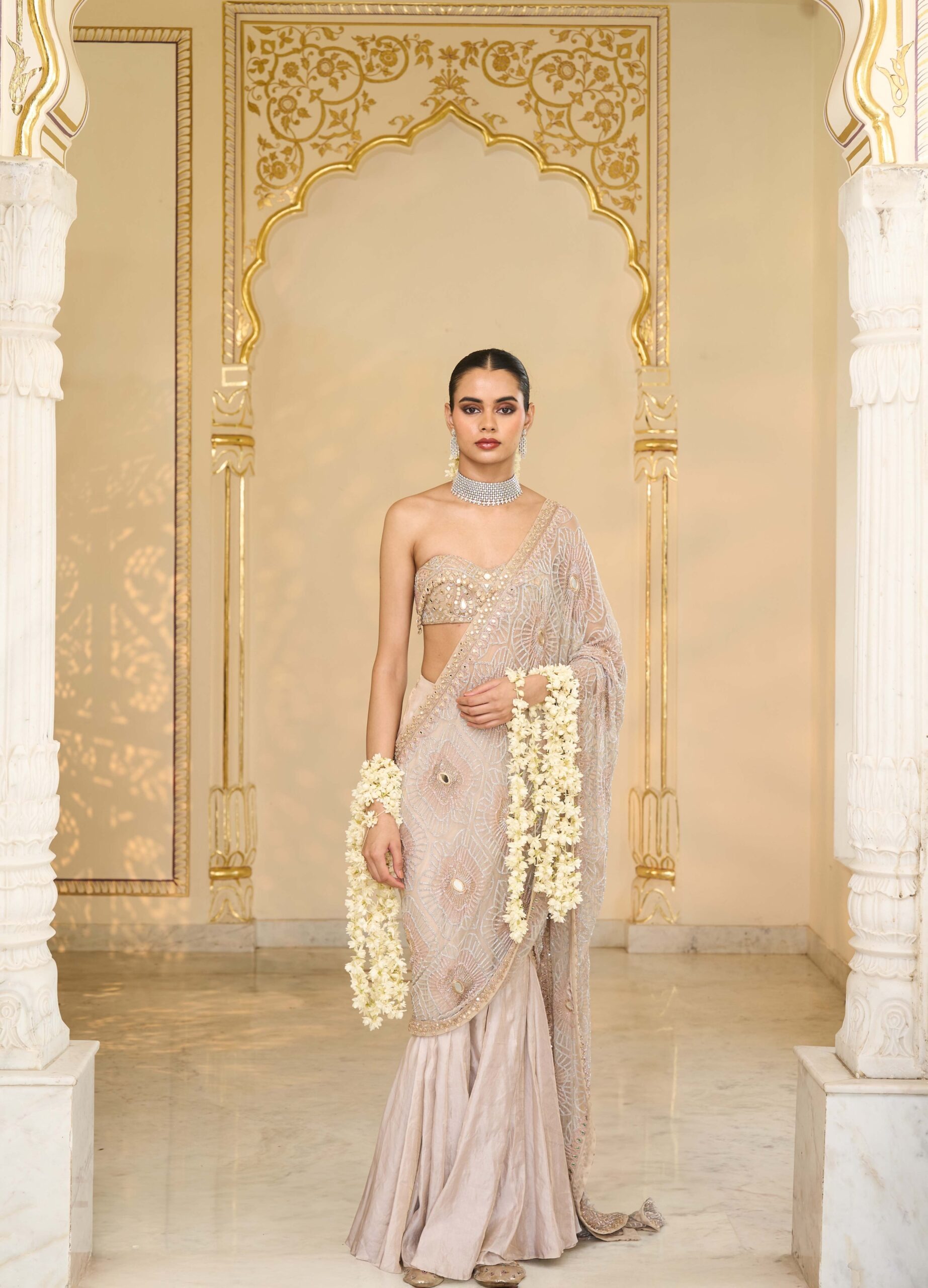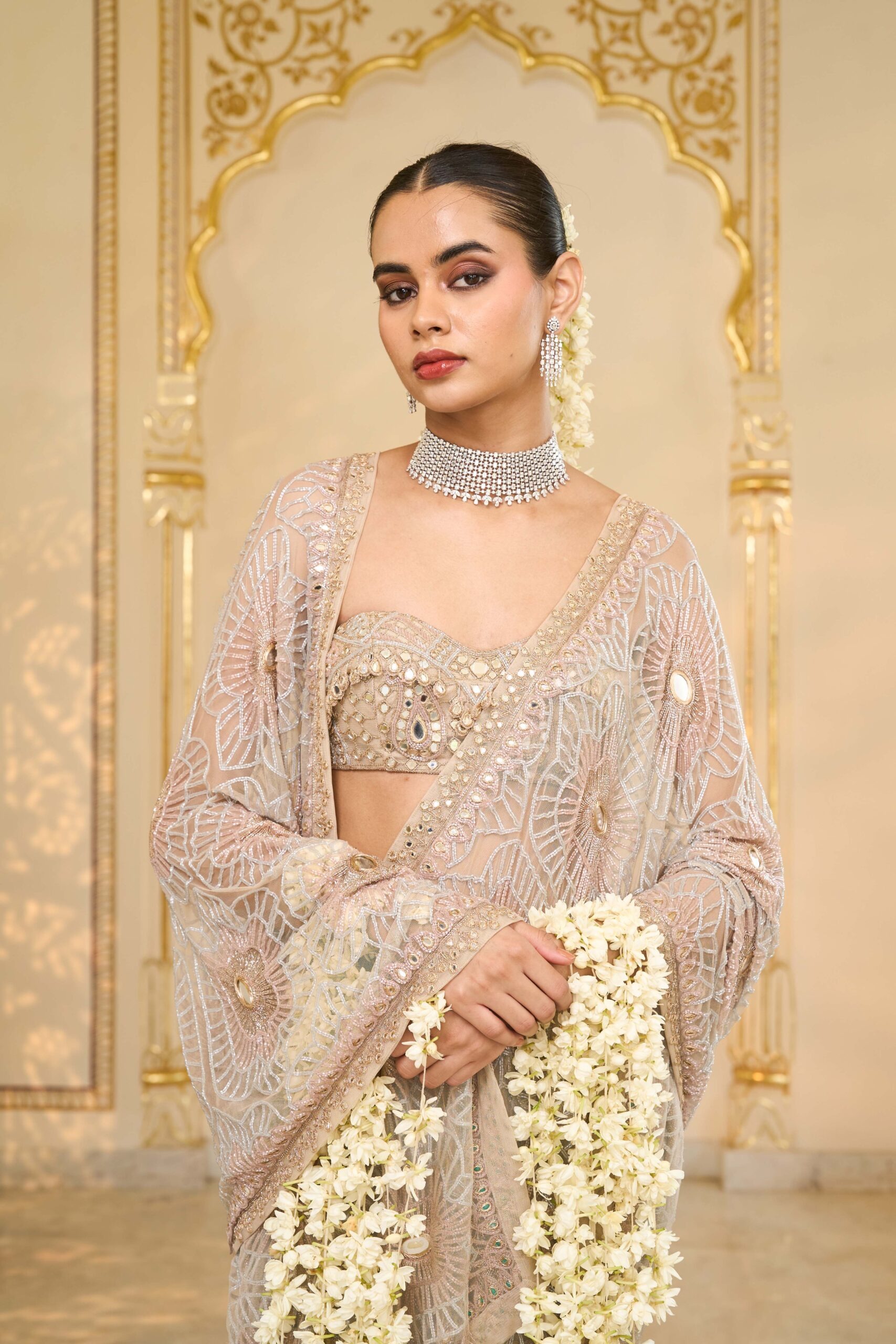 The saree is crafted from luxurious tissue fabric known for its luminous texture and graceful fall. Designed with godet panels, it adds subtle flare and flow to the silhouette. The material’s soft shimmer enhances movement, giving the saree an elegant and elevated presence perfect for weddings and receptions.