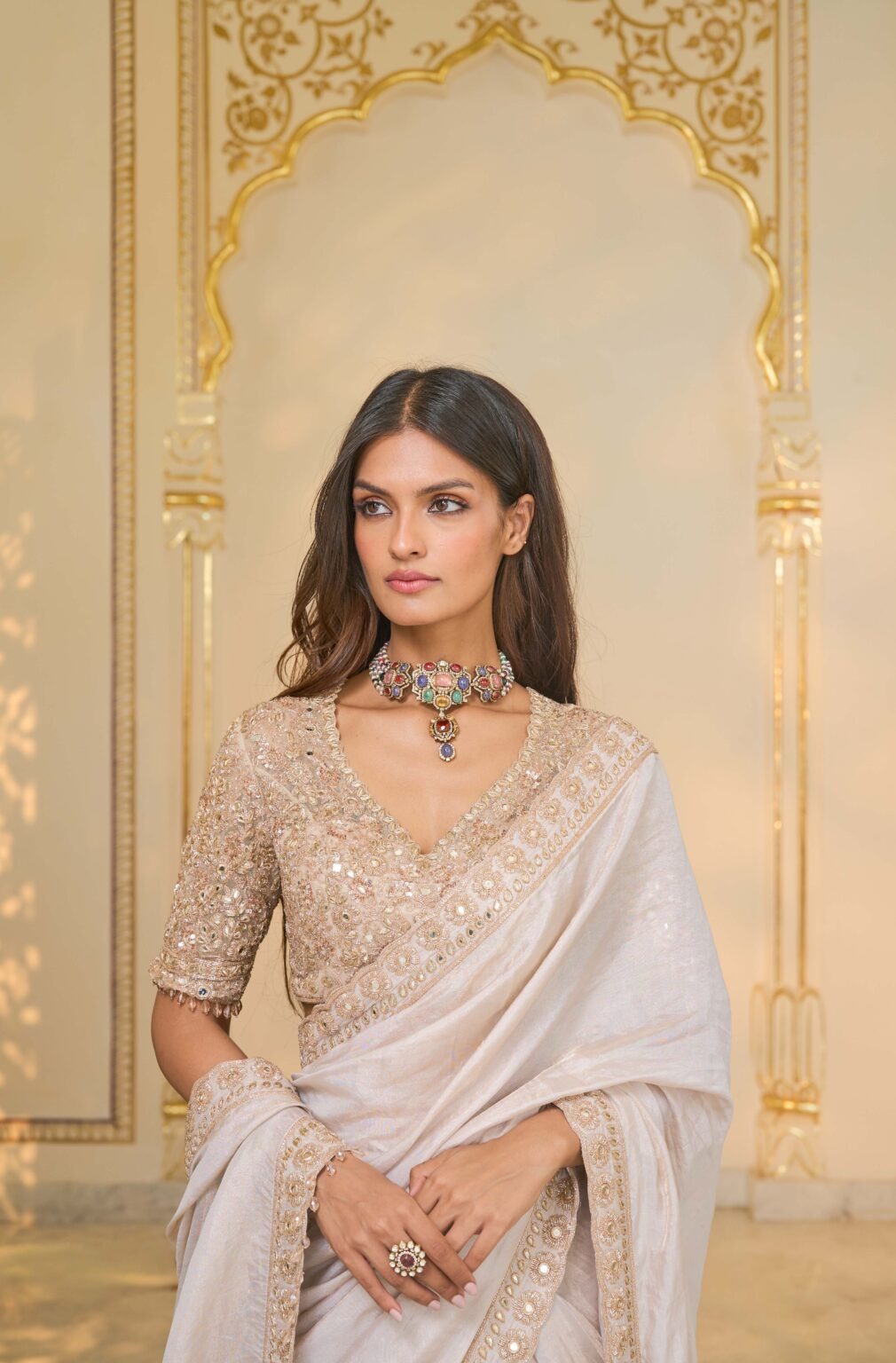 The blouse complements the sari with a tailored silhouette that supports the ensemble’s refined aesthetic. Crafted from coordinated fabric, it features embellishment placed with precision to create harmony with the sari’s artistry. The fitted structure provides comfort while maintaining a polished and regal appearance.
